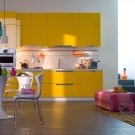 - Color zoning. This option can be combined with other solutions - Flooring, walls, ceilings, furniture - a wide field for imagination. For the main zone, you can choose a color palette, textures and materials that contrast the rest of the space. For example, the kitchen can be made in rich yellow-green shades, and the remaining space in bright colors.