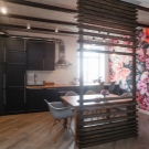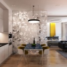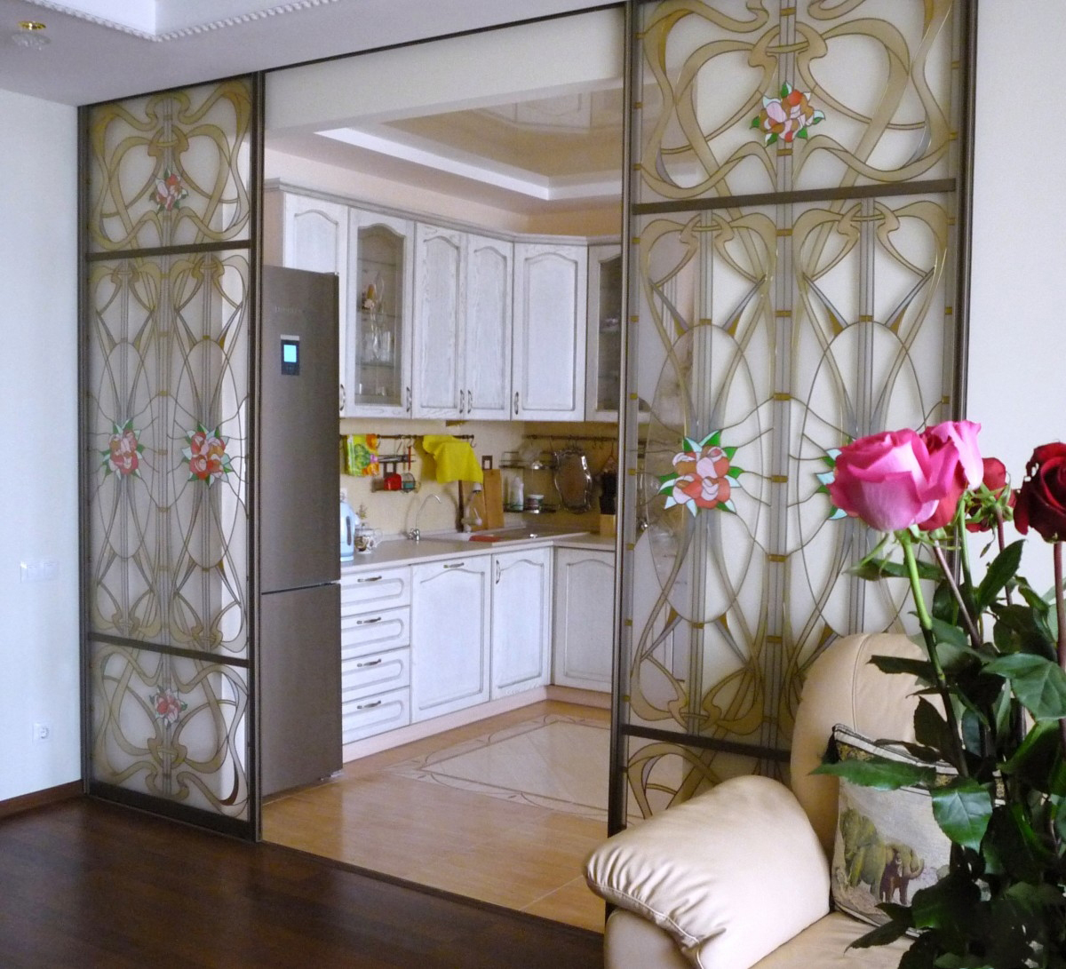 - Sliding partitions. The most convenient and practical option will allow you to separate one zone from the others. This screen can be used to separate the sleeping area or kitchen area. To make this design not look heavy, you can choose from light or translucent materials: frosted glass, stretched fabric or stained glass. Beautiful pattern on the partition wall will be a real decoration of the interior.