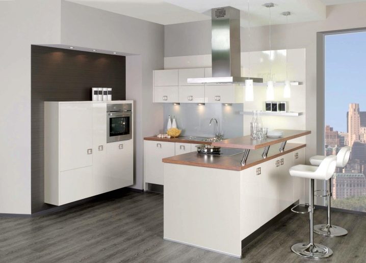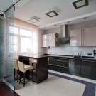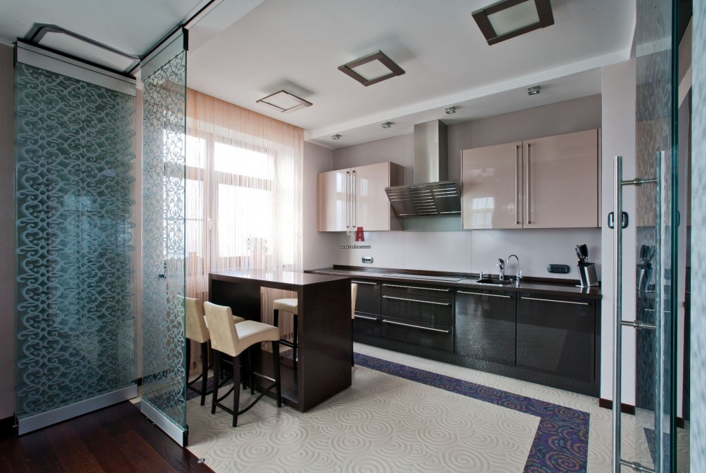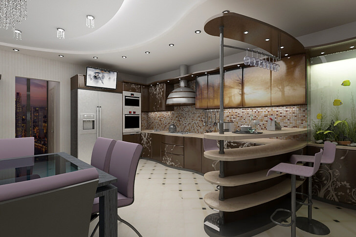 The space under the bar can be used for storing cereals or kitchen utensils. This rack can be placed on the surface of the sink and the cooking surface. Suspended modules for fragile dishes will complement the design. A fairly wide countertop surface will be a substitute for a dining table.