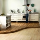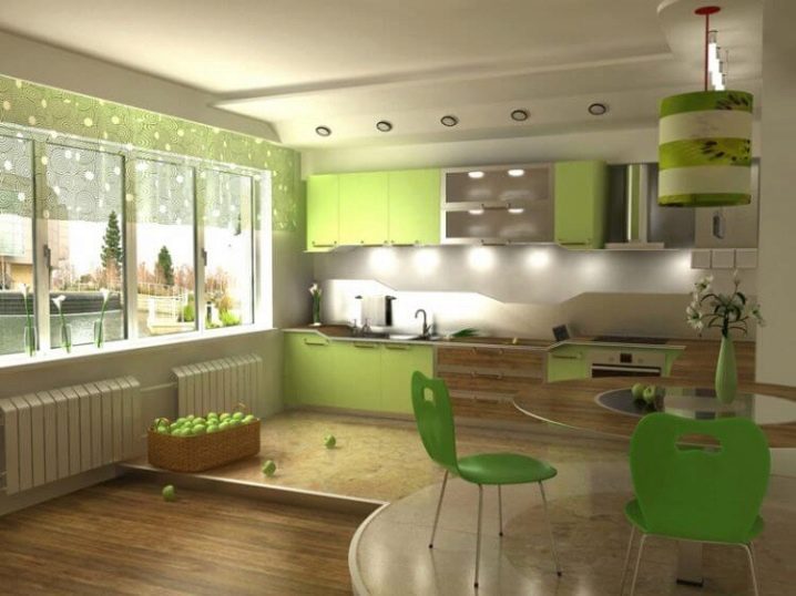 A small podium will raise the kitchen space above the rest. To enhance the effect in the height of the catwalk, you can insert spotlights or LED strip.