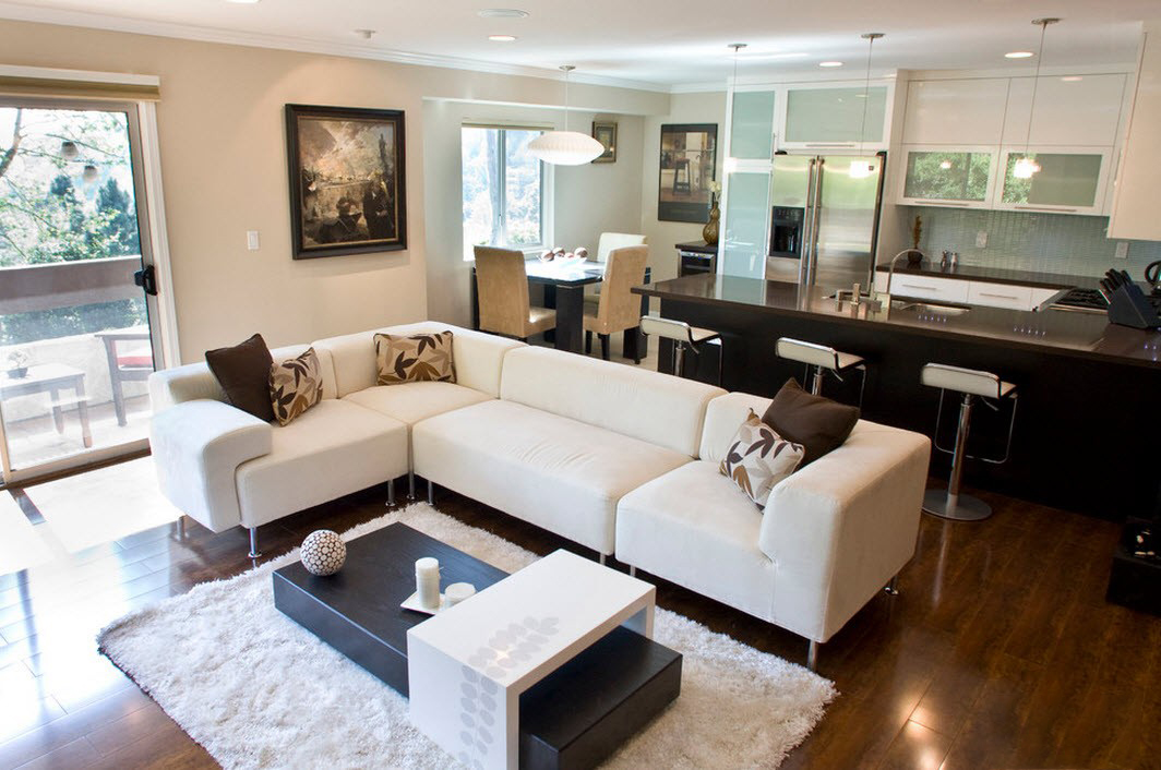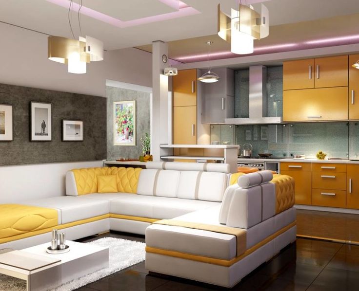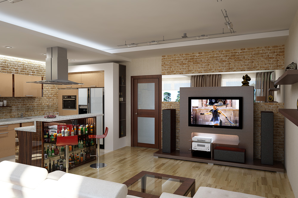 This layout increases the space of the room, it does not seem cramped and uncomfortable and allows you to move freely. Ideal for small apartments, where the project of the living room and kitchen are divided by a partition into too small areas.
