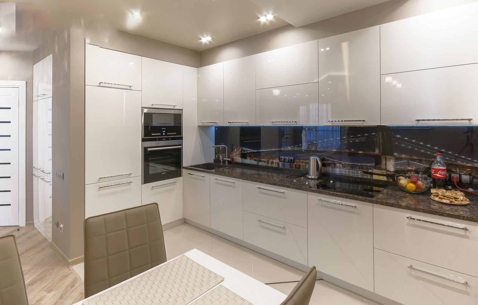 Mini mirrors, glossy surfaces of furniture together with stretch ceilings with a glossy texture will help to visually increase the space. These surfaces are excellent reflectors of light. Installing glossy cabinets from the ceiling itself will allow you to visually expand the space and create a large area for storing kitchen trifles, dishes and food.