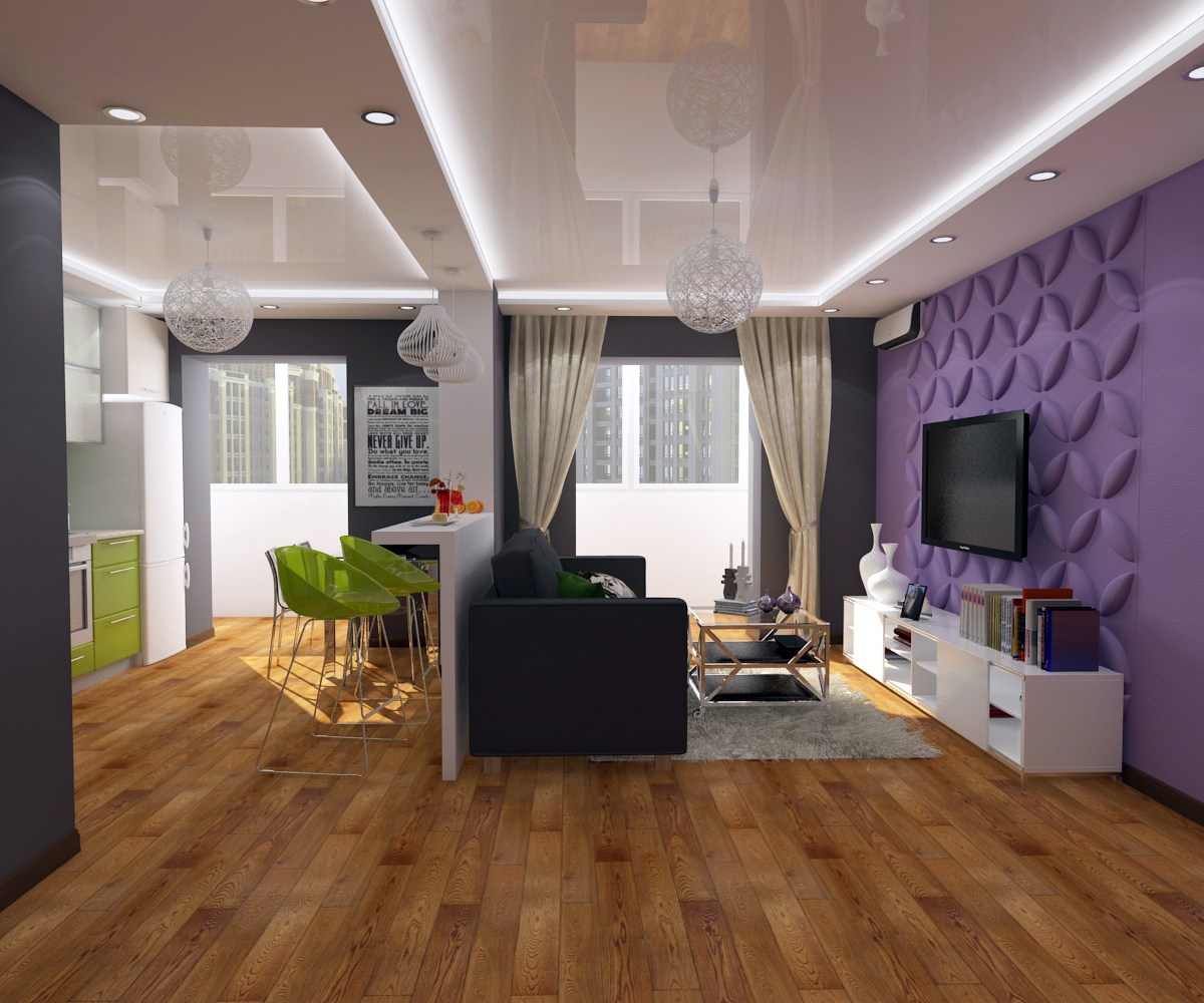 More attention should be paid to lighting. Illumination will help to divide the zones of the room and make them more comfortable. You can brighten up the kitchen and work areas, while the living room and bedroom will have soft and warm lighting.