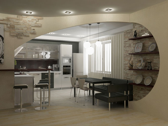 Redevelopment is a costly process. If the kitchen-studio is not provided for by the plan of the apartment, you will have to do it yourself: wall demolition and decoration, removal of an impressive amount of garbage.
