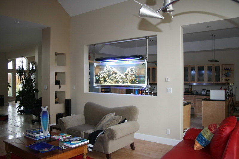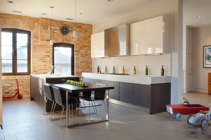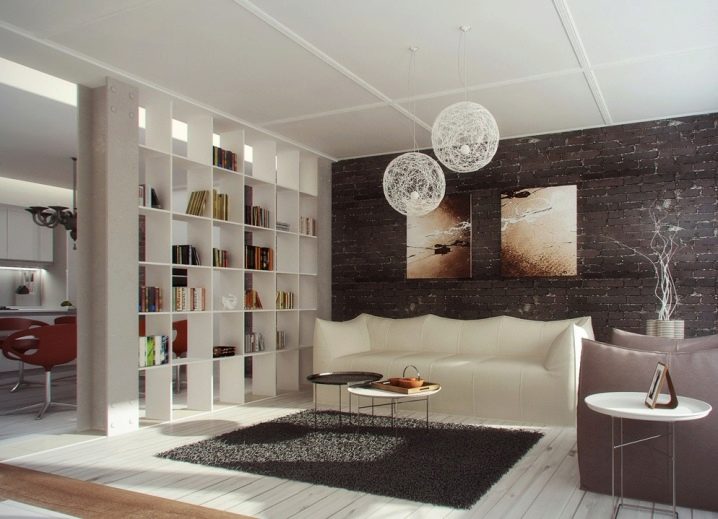 You can experiment and make the partition pass-through. With sufficient thickness in the empty spaces fit books, beautiful statues, kitchen utensils, or even an aquarium. If the partition is installed from wall to wall, in the middle you can make a large opening or “window”, it is very convenient to place a tabletop in it, which will replace the bar counter or dining table.