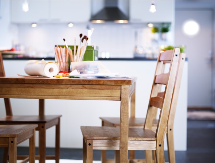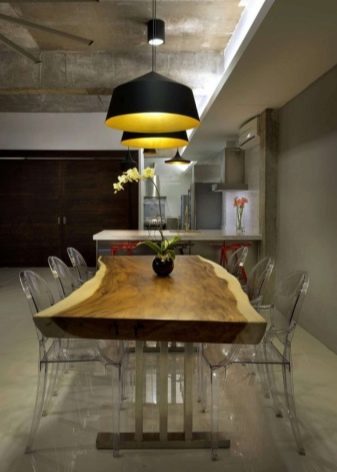 A kitchen table with untreated wood worktop, complete with metal legs is an excellent choice for a loft-style room. A plastic model will look great in the kitchen, designed in the direction of high-tech.
