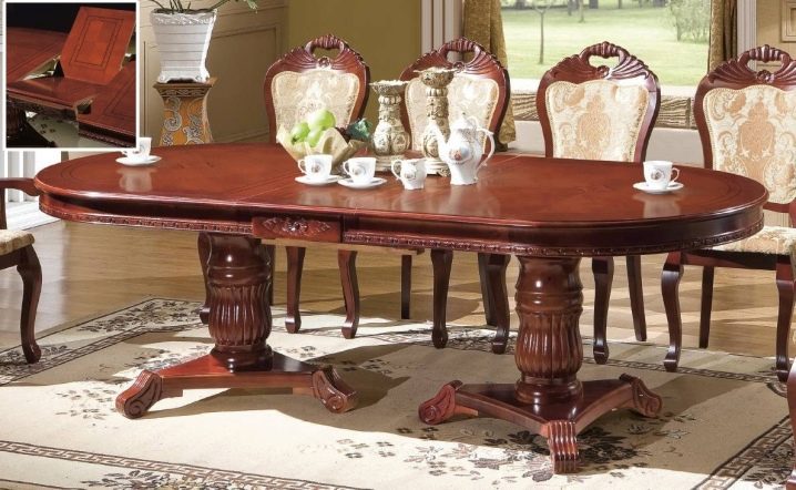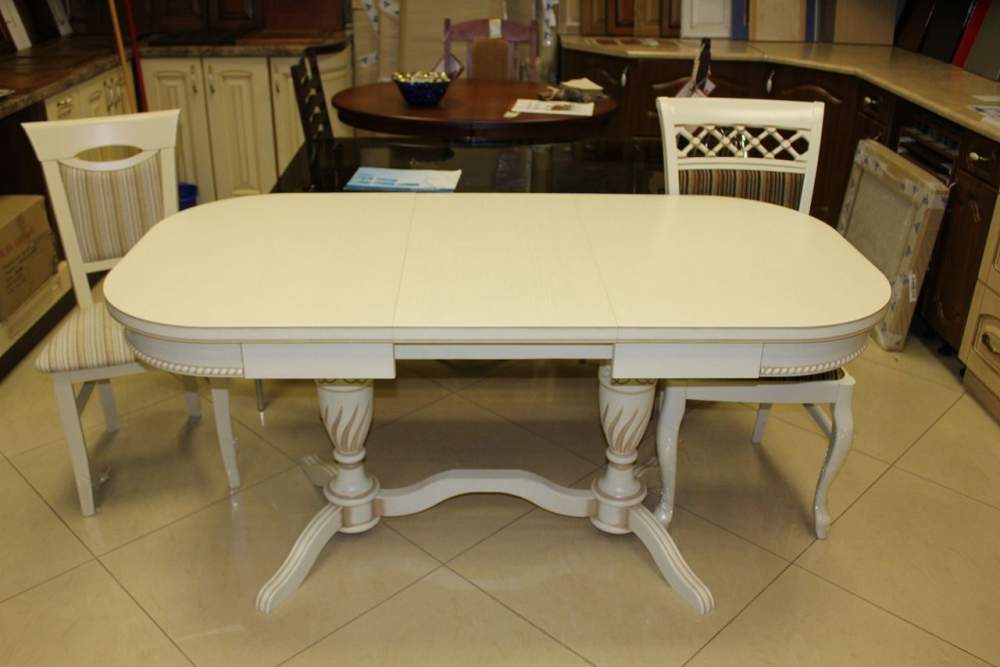 Dining tables with two legs usually have an elongated shape and are small in width. This is not a very comfortable option, since you can sit behind it only on both sides.