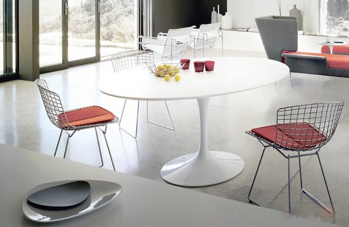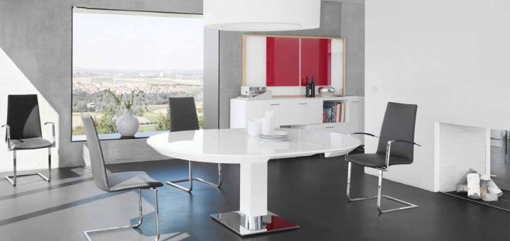 Tables without corners are ideally combined with corner sofas and kitchen corners. This upholstered furniture allows you to efficiently use the corners of the room, and the round or oval shape will make food intake as comfortable as possible.
