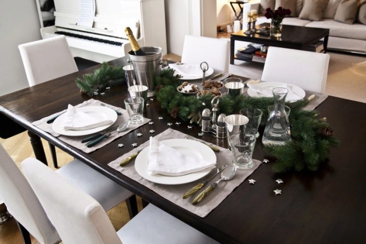 It is appropriate to put a live potted plant in the center of the table. Such decoration will organically fit into any interior.