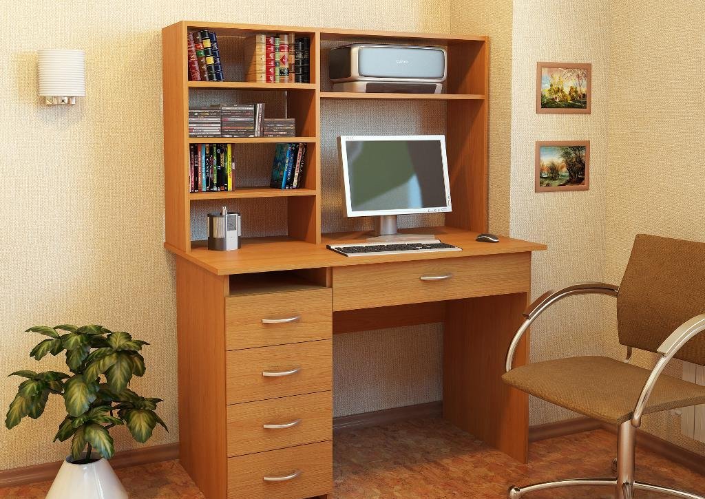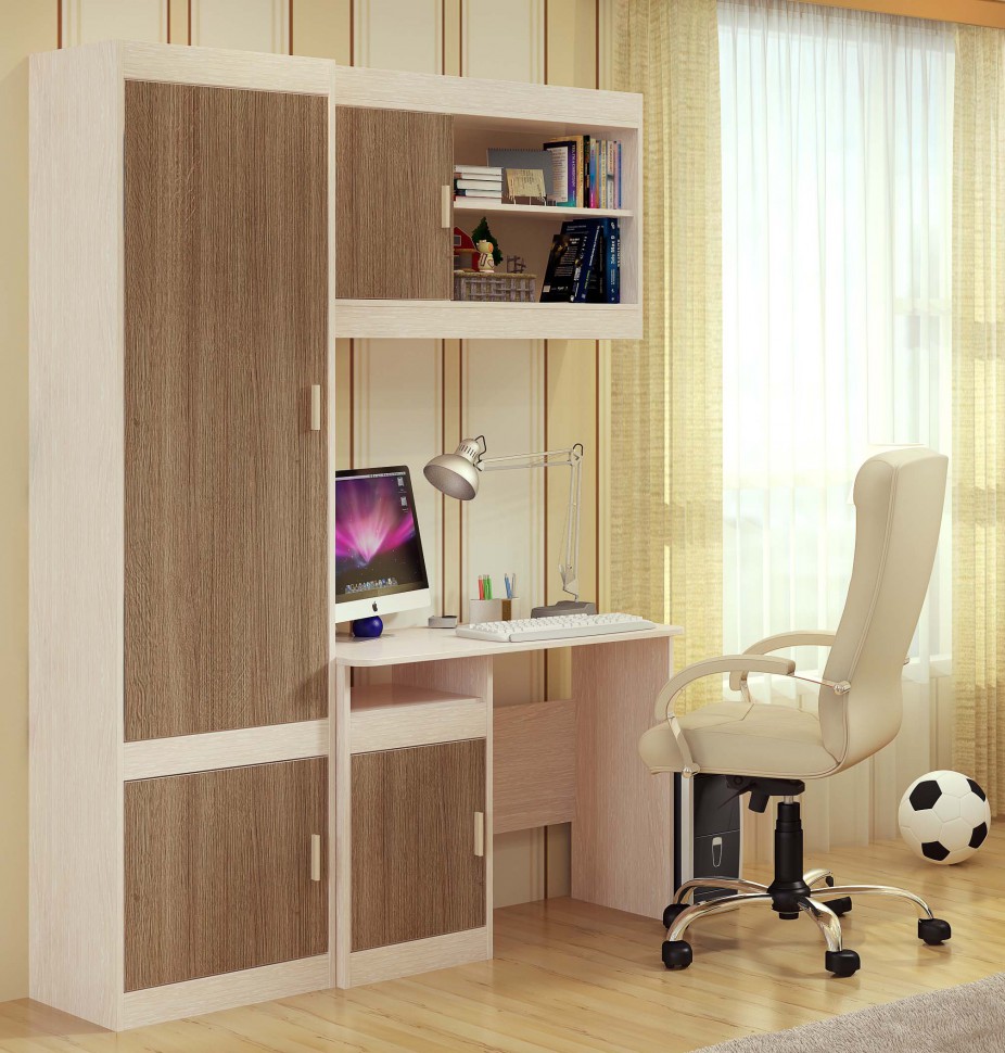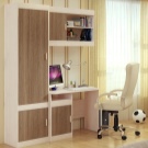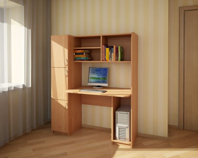 Schoolboy-1 Producer The variant is a regular computer desk with drawers, with shelves, the door of which is closed with a facade and open shelves for books. Its dimensions are 50x90 cm, which allows it to be installed even in a small room. Made of wenge or oak laminated chipboard.