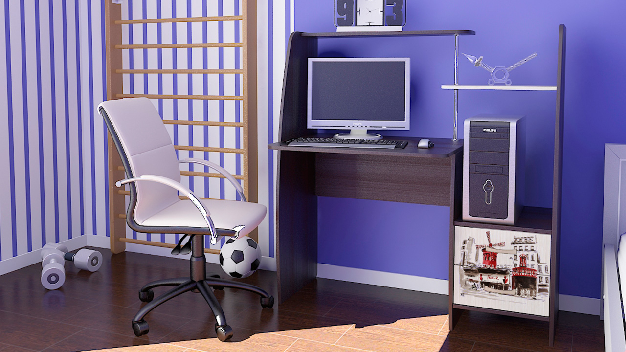 Computer desk Schoolboy mini of the same manufacturer has a convenient stand for the processor, a high pedestal for the monitor and a separate shelf for the keyboard. This frees up space on the main desk, where lessons can be learned, and the computer will not interfere. Its dimensions are 60x115 cm. Wenge color. Material chipboard.