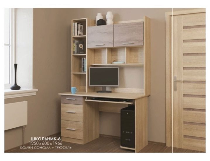 Schoolboy-6 has a large number of boxes, a stand for the processor. This is a great option for equipping a teen room with everything you need for a work area. This table is painted in wenge / oak and Sonoma / truffle. Dimensions 60x125 cm, height of construction is almost two meters. Material LDSP.Transya table furniture factory Triya - great if your child has a laptop. Its design allows you to change the height of the table from 58 cm to 77 cm, also changing the angle of the tabletop. At such a table it will be not only convenient to study at a computer, but also to write and read. Made from laminated chipboard, the dimensions of the table top are 60x90 cm. It has a convenient drawer for trifles. Oak and wenge color.