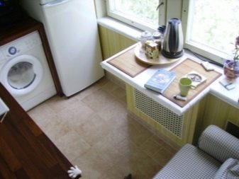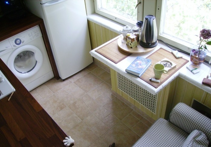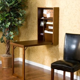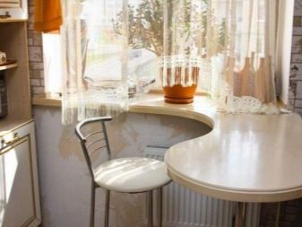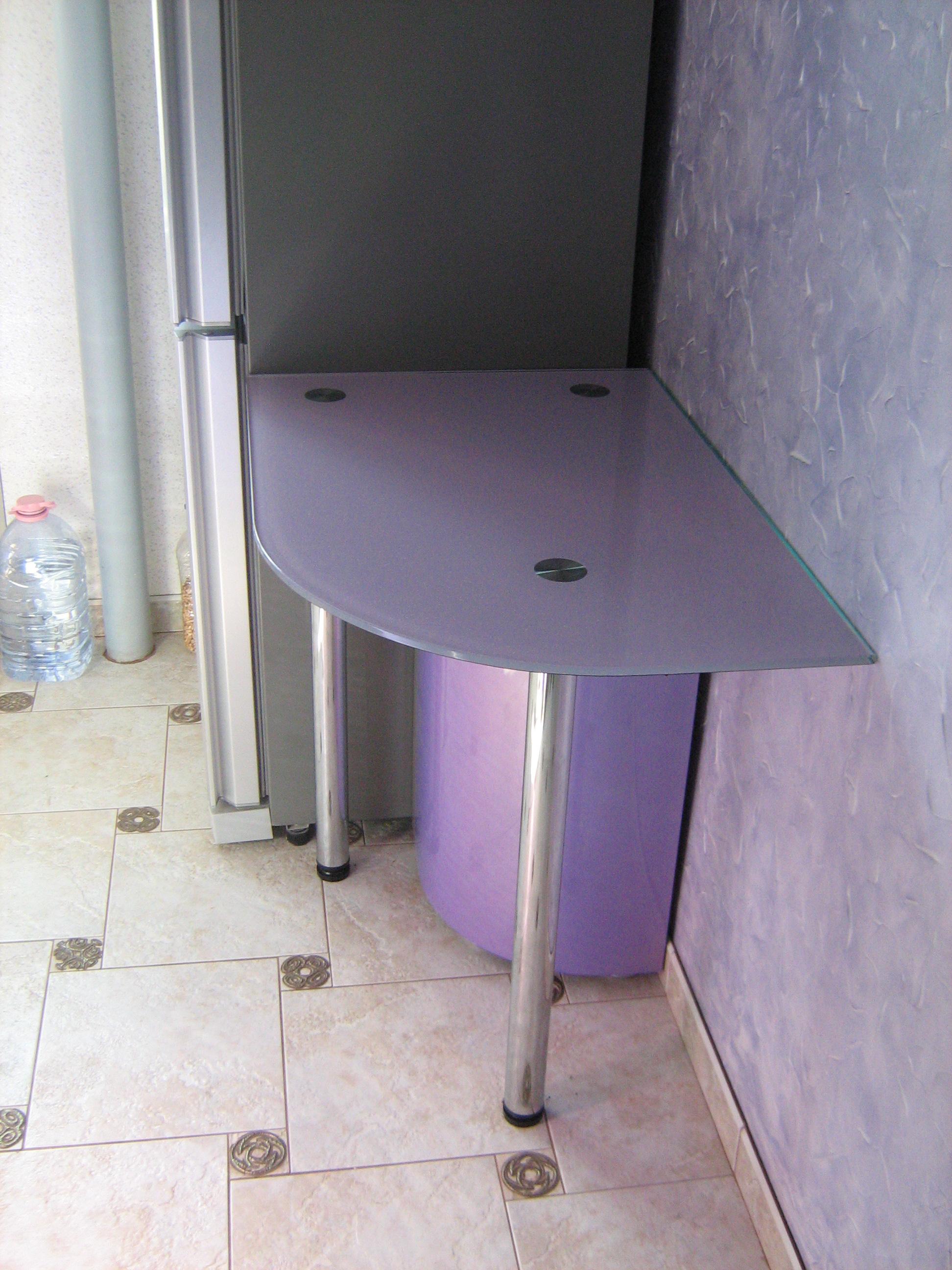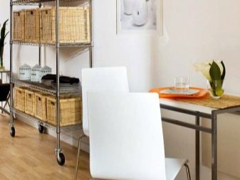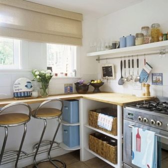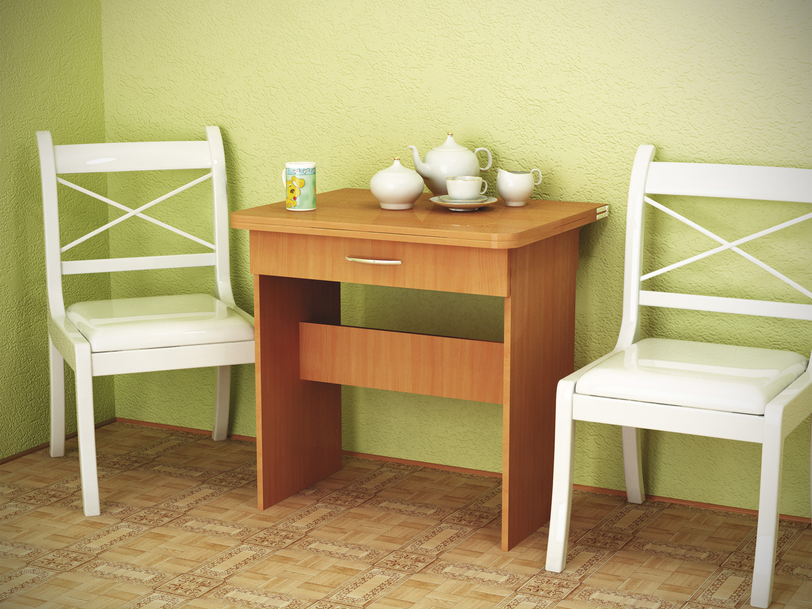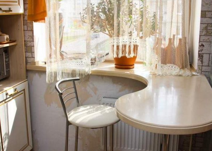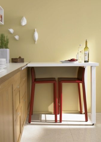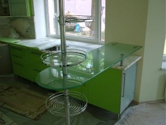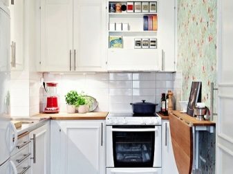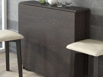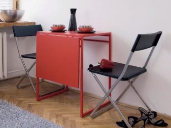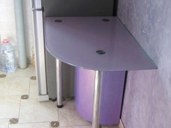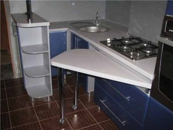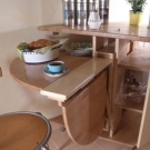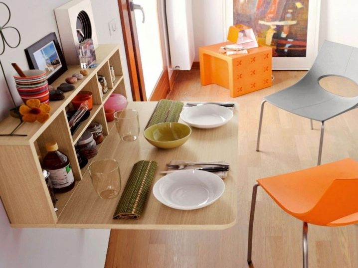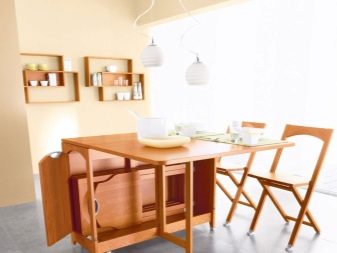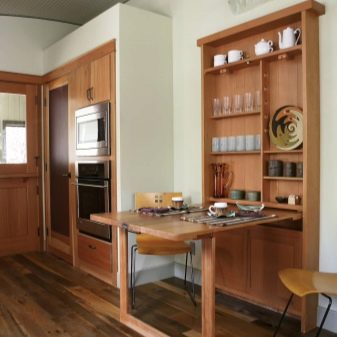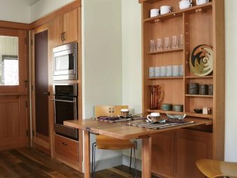 By the same technology, and arrange folding table, similar to the onewhat is in the passenger cars and in the unfolded form rests on one or two retractable struts, and in the folded it looks more like a narrow panel. In a miniature kitchen, its base is often made in the form of a shelf for jars with spices.