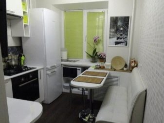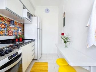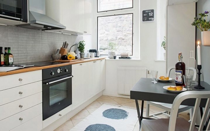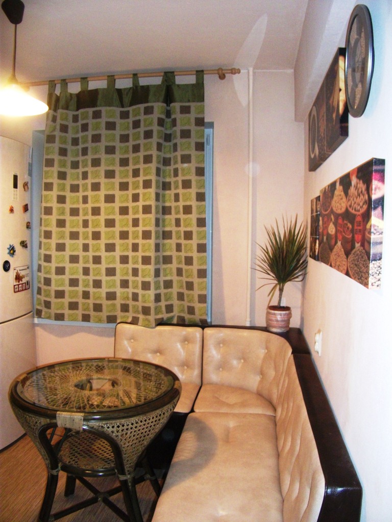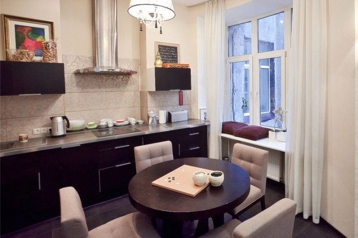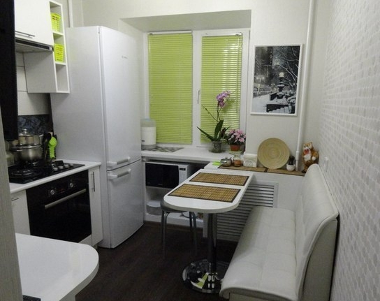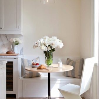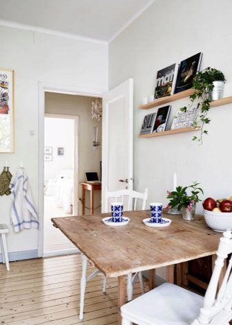 An interesting micro-version - one-legged hinged table, which is usually fixed with a long or short side to the wall or integrated into a kitchen set - as is more appropriate to the layout. With comfort, only two or three family members can be accommodated behind it, therefore breakfast or light dinners are usually served there, and full meals and festive meals are transferred to the living room.