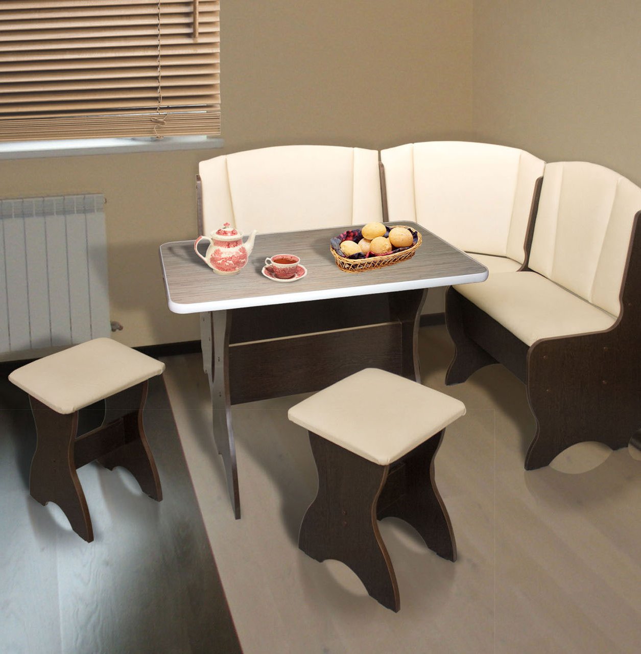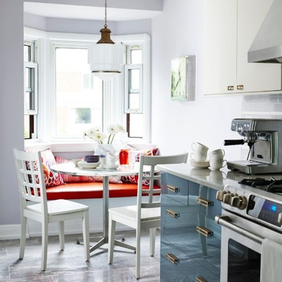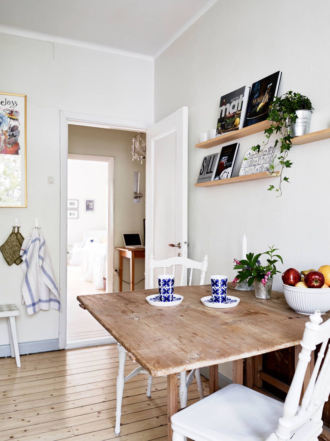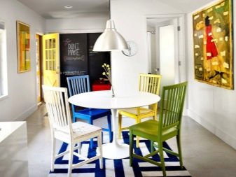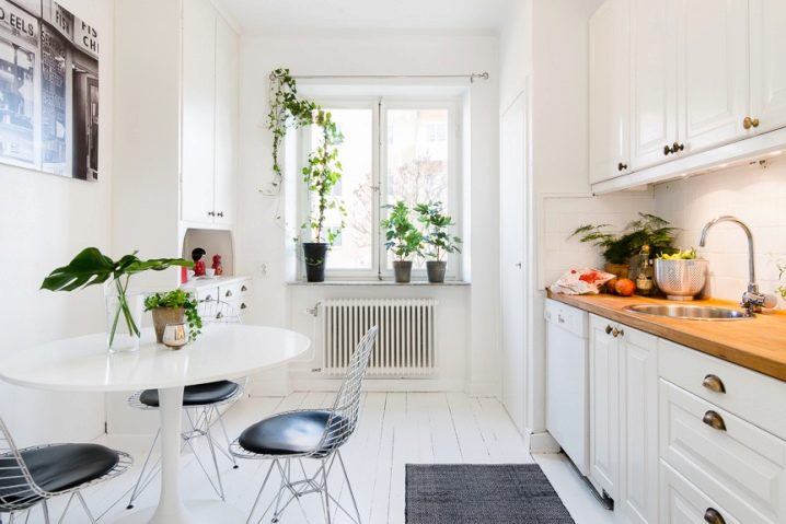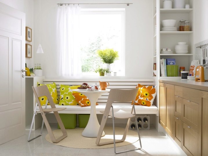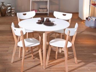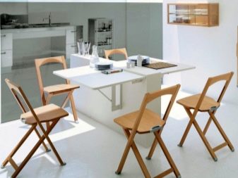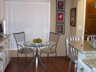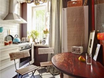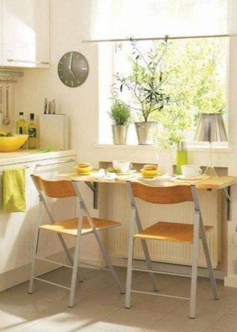A small bistro table, similar to the cafeteria tables, can comfortably sit in the company of a pair of elegant chairs in a corner or by the window. Or a folding table in the summer cottage style can take its place, which, if necessary, can be removed altogether behind the cupboard or in the pantry with chairs similar to it.