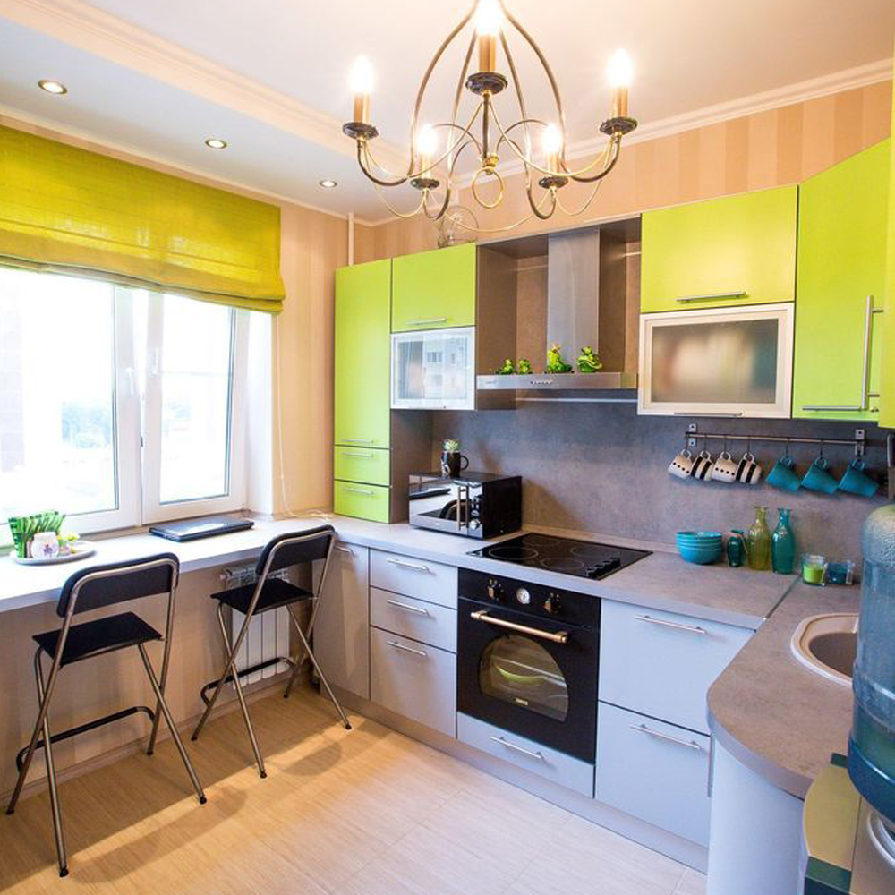 All types of transformable tables (even with roll-out, even with a folding table-top) are easier to integrate into a small kitchen space, if they are made to order with all the room features taken into account. Thus, a larger, longer-serving part of the long tabletop of floor cabinets, which does not require additional support, may turn out to be a small kitchen table. Or they will be one of the segments of the working island, in one part of which a cupboard will be built in, and in the other a sink.