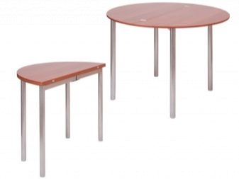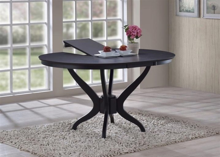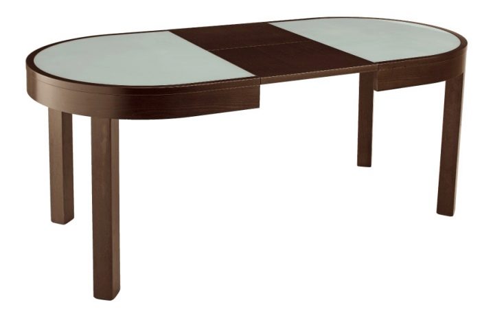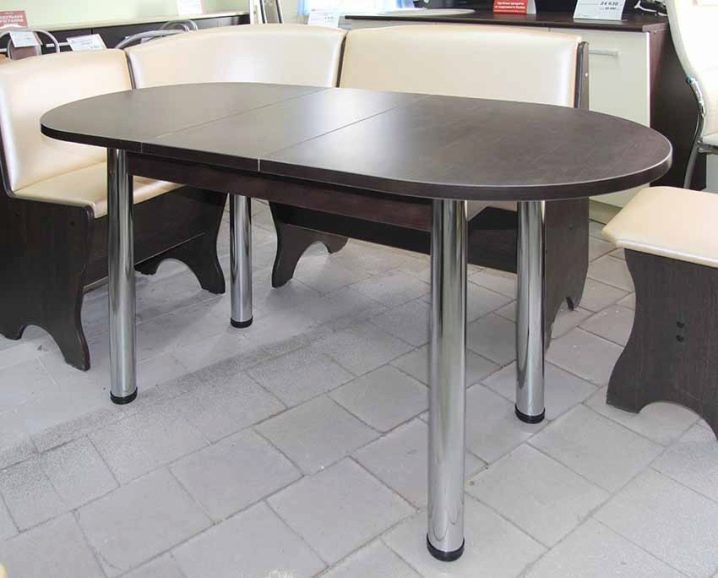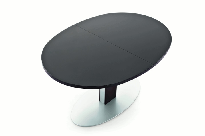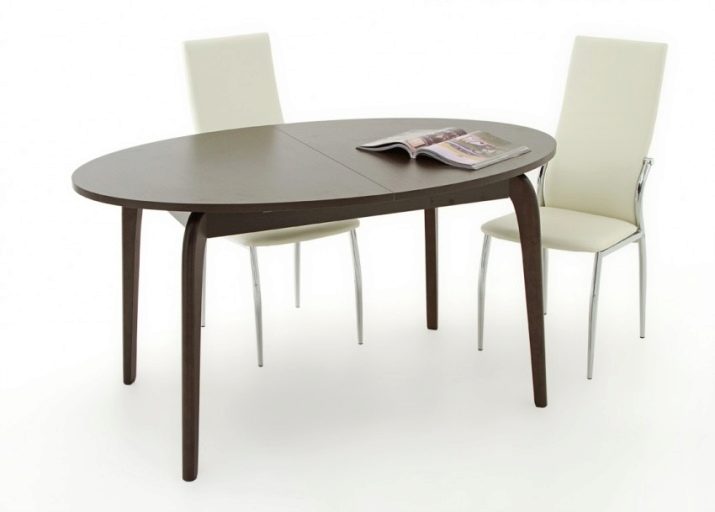 Oval sliding table for the kitchen has a tab, due to which it is increased. When there is no need to enlarge the tabletop, the tab is under it. There are some models where the tab is automatically extended with the help of special parts.