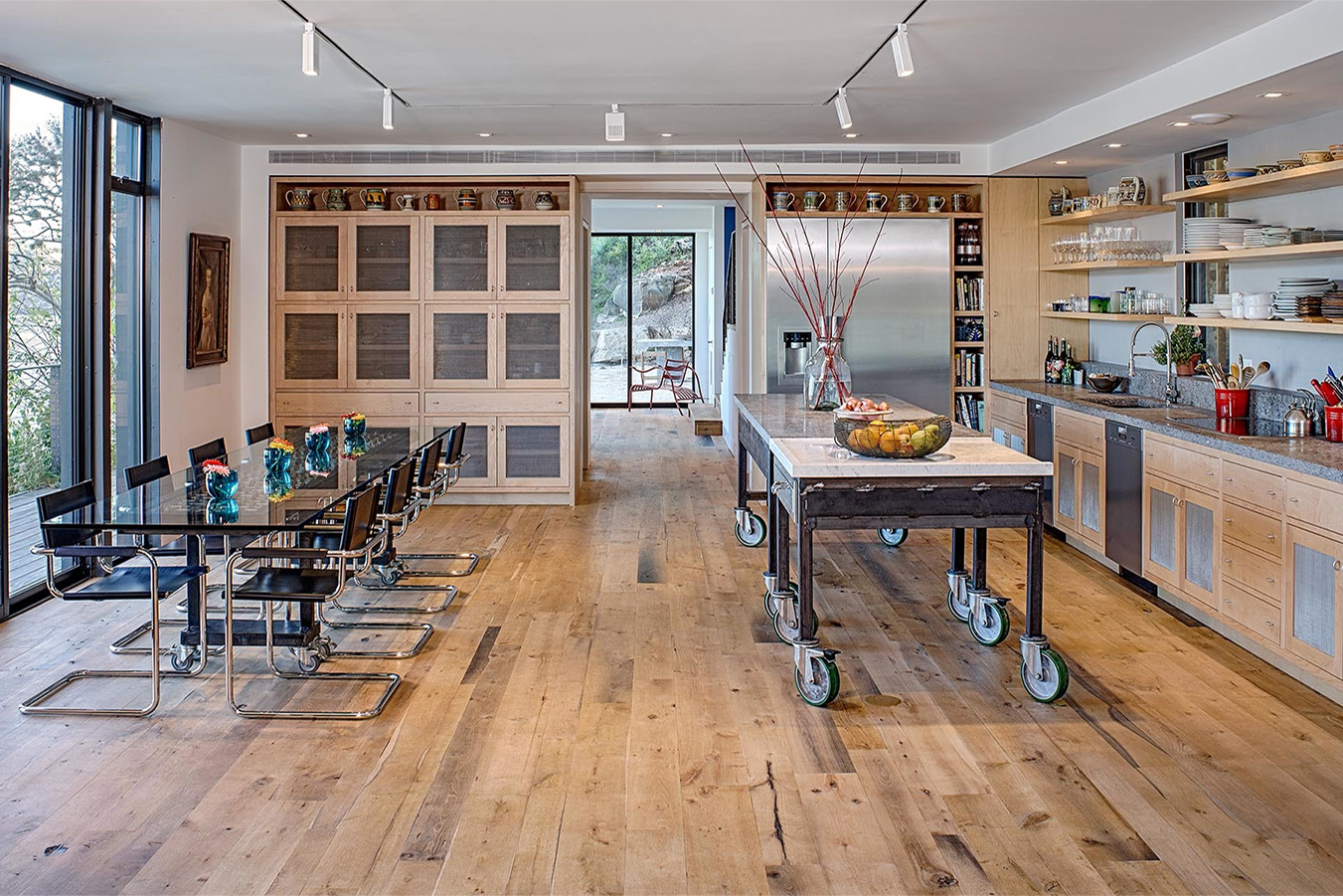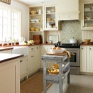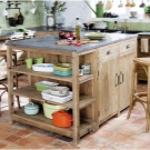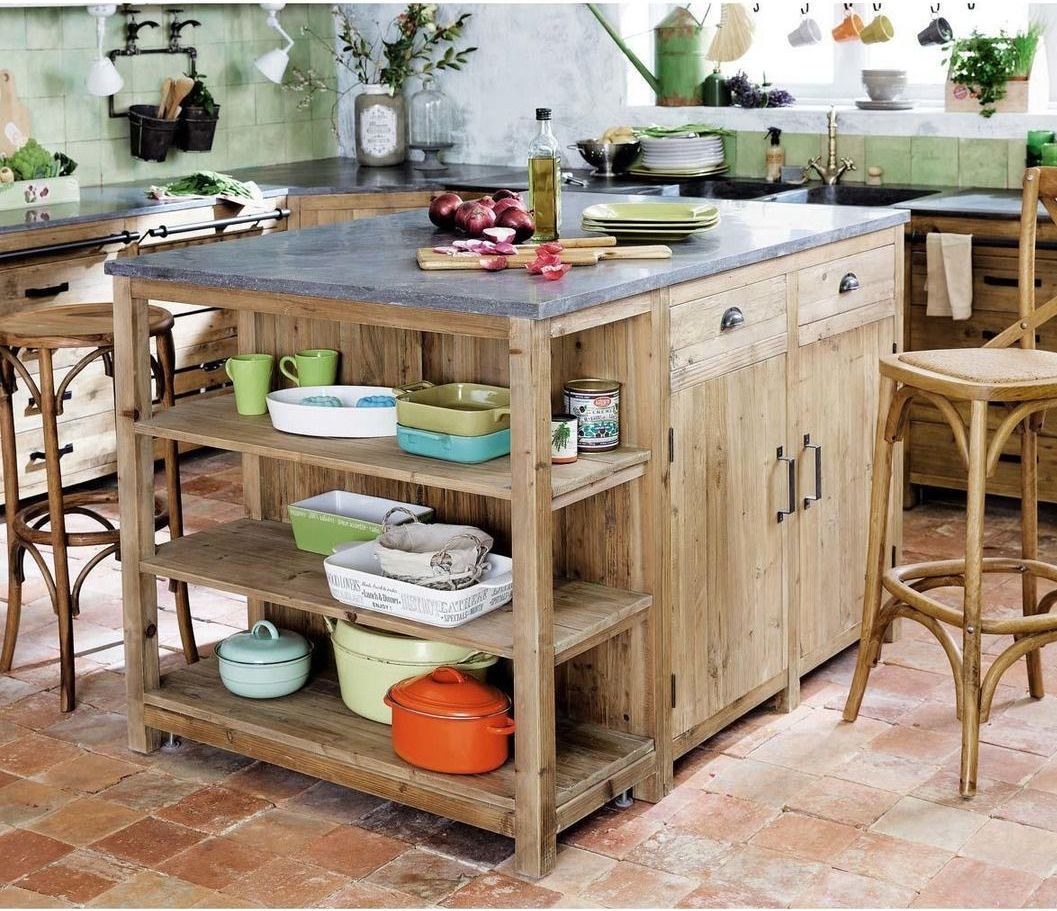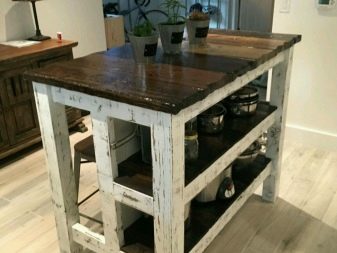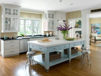 Desktops vary in configuration and location. In most cases, they are located in the middle of the kitchen. It can be a two-door cabinet with drawers, in which it is convenient to put the necessary kitchen utensils. A separate cutting table can also be equipped with drawers, or be in the form of a buffet with a desk.