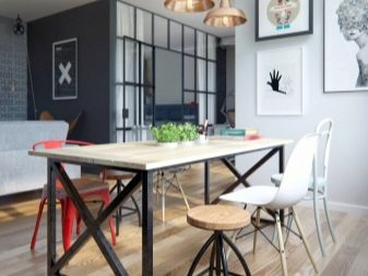 For example, a “rough” table made of wooden planks laid on trestles will fit well in a country-style kitchen. For lovers of eco-design wicker furniture will do, and the brutal version with thick iron legs and iron edging will look good in a loft-interior.