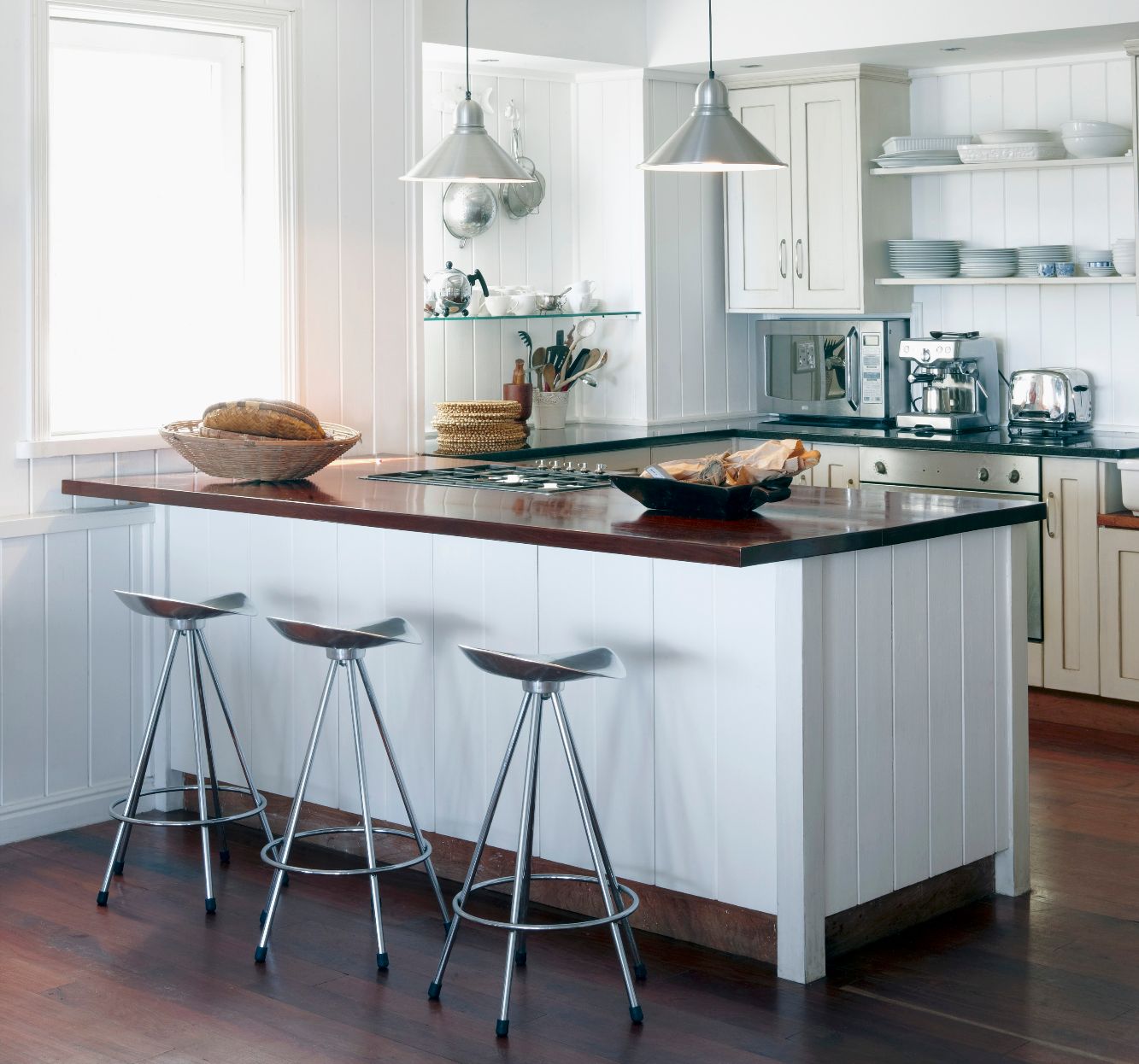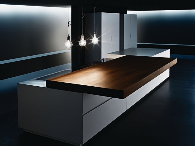 The working surface looks very stylish in the form of a separate thick board mounted into the wall, without bottom supports. Such a laconic design would be appropriate in a spacious kitchen in the style of minimalism or high-tech.