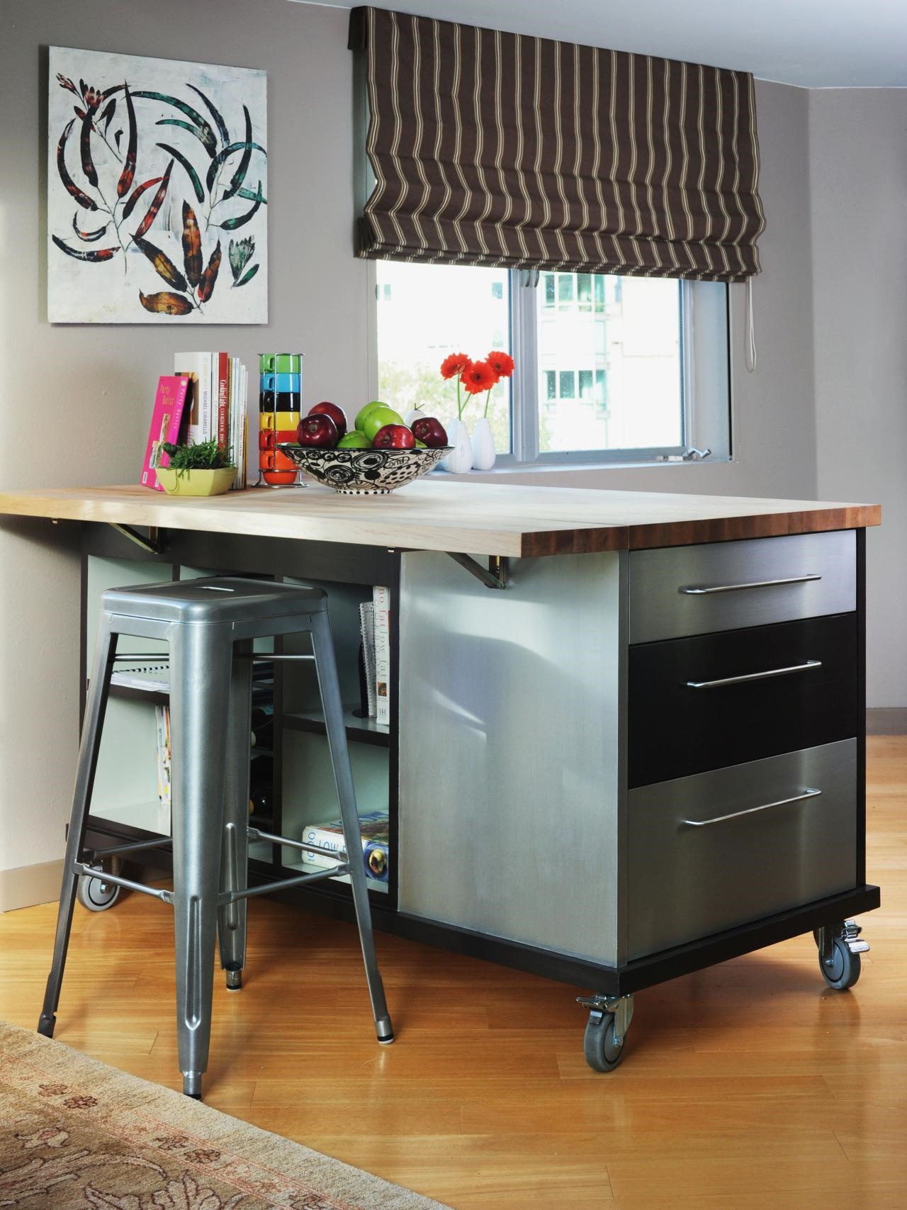 Also, a stand-alone desktop is relevant in a studio apartment when the kitchen is represented by a kitchen island. In this case, it is convenient when the working table is on wheels - then it can be easily moved, pushed in case of uselessness or served on it to the dining table.