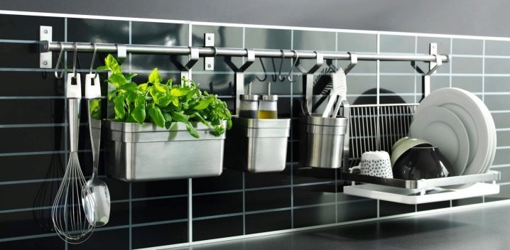 - Horizontal railing above the table top. It can accommodate the most commonly used items - towels, potholders, vanes, ladles. On the magnetic railing it is convenient to place all the knives. Shelves for spices or a napkin holder can also be hung there.