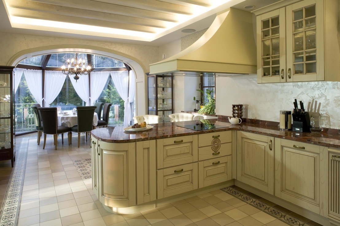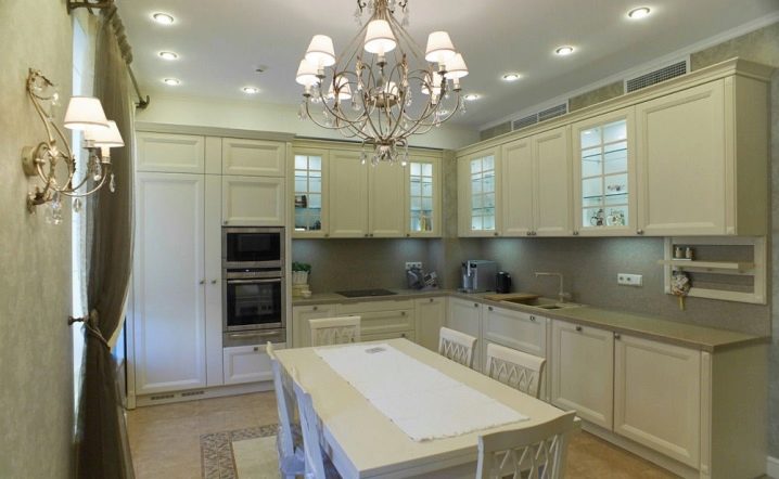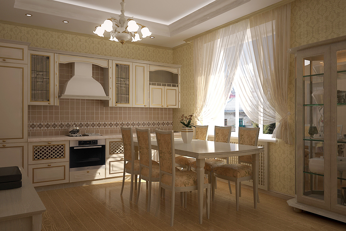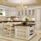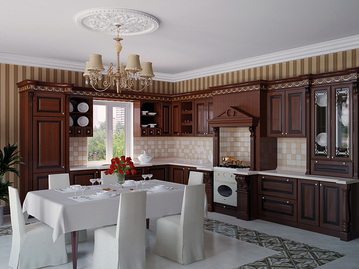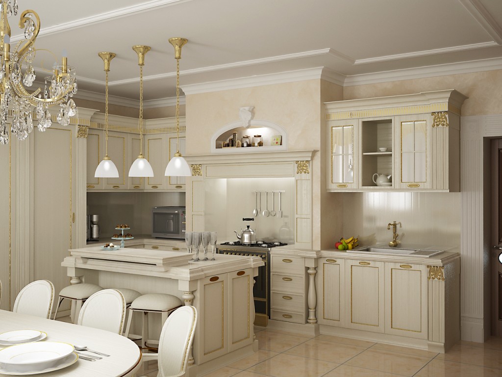 In any case, the furniture should be of high quality and expensive, mainly of wood. Household appliances - built-in, hidden from view. For lighting, use the chandelier, you can also place auxiliary lighting in the form of spotlights. The color scheme of the classic kitchen should be warm, without sharp contrasts and bright spots.