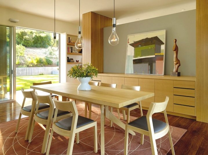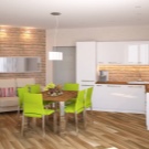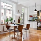- decide on what you will sit on. These can be chairs with soft or hard seats, stools without backs, small chairs with armrests or a soft corner with a sofa. Chairs and stools are more functional, mobile and take up less space; the upholstered furniture will turn the dining room into a cozy guest corner; Well, chairs can be a little bulky and not suitable for kitchens with a small area;
