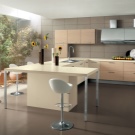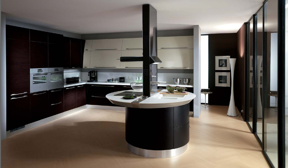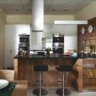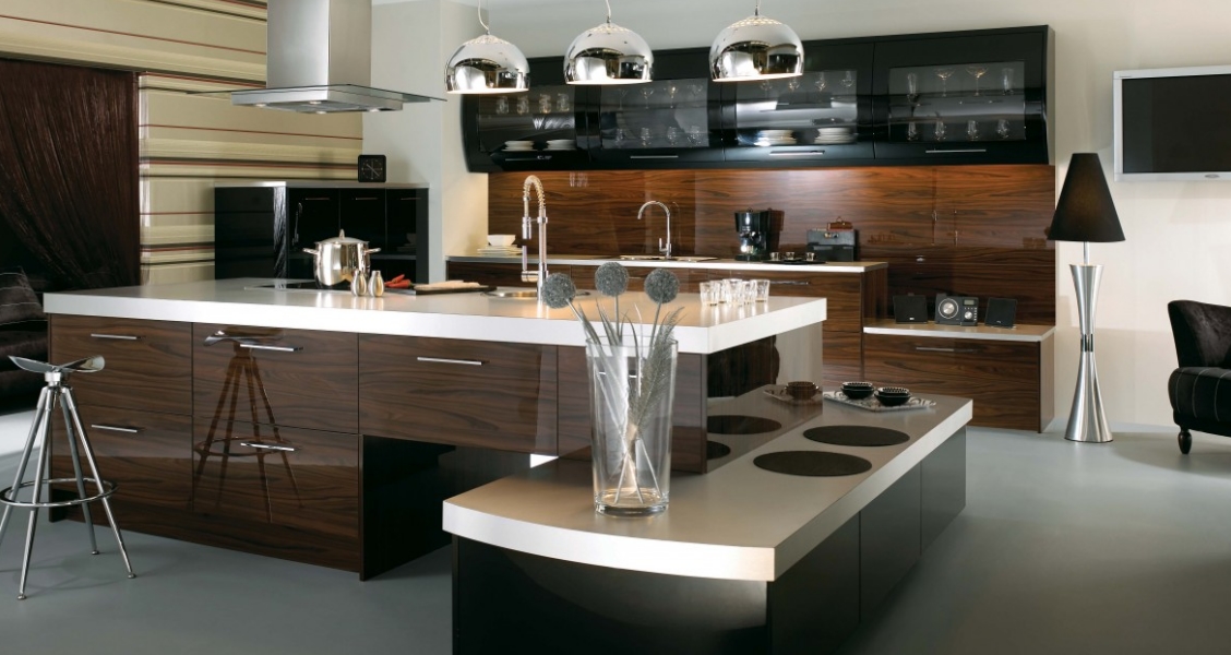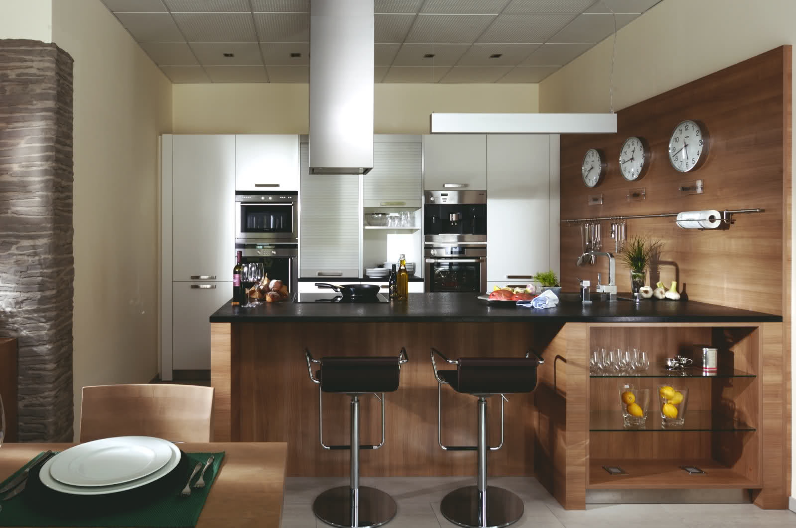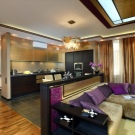 - Modern This style is characterized by asymmetrical details, smooth lines, smooth corners, curved shapes. Space zoning is very often achieved with a rounded bar counter. At the same time, the furniture should not clutter the space, it should be as functional and comfortable as possible.