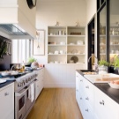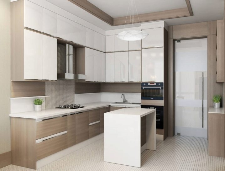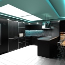 - L-shaped layout.Its characteristic feature is the placement of the kitchen unit along the two walls that form the corner. Such an arrangement of furniture is often found in kitchen-dining rooms with a small area (from 8 sq. M.) And allows for very efficient use of space. In elongated kitchens, this type of layout is the most convenient;