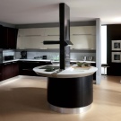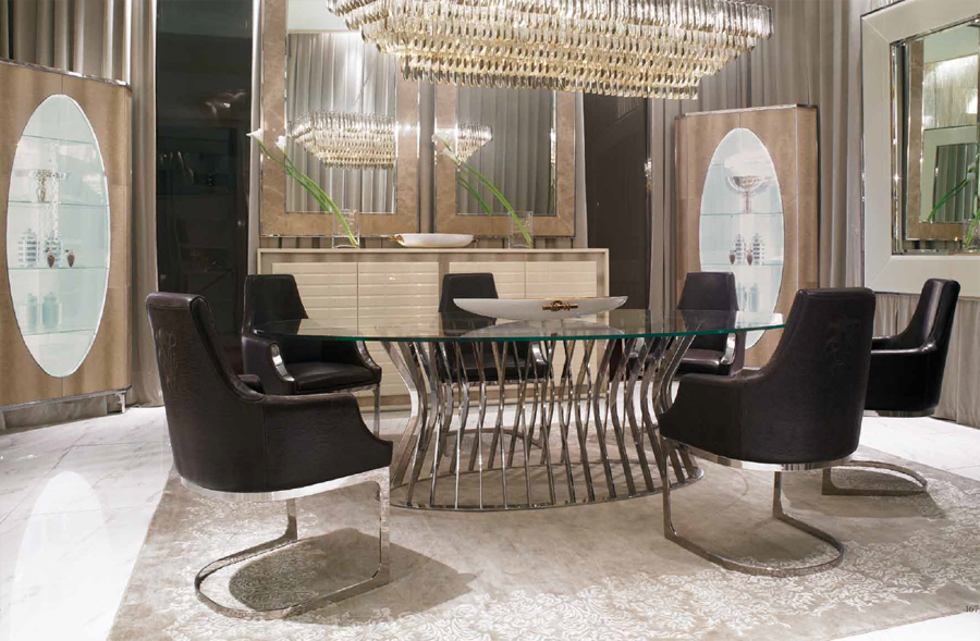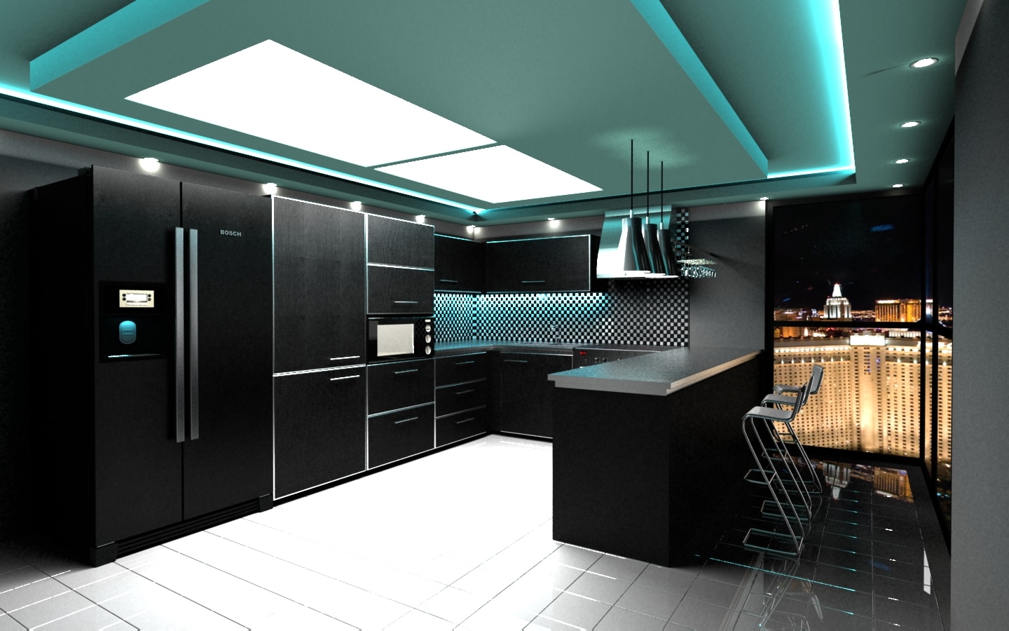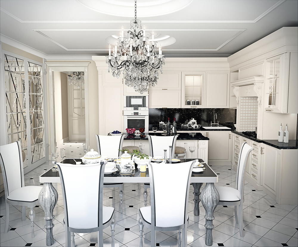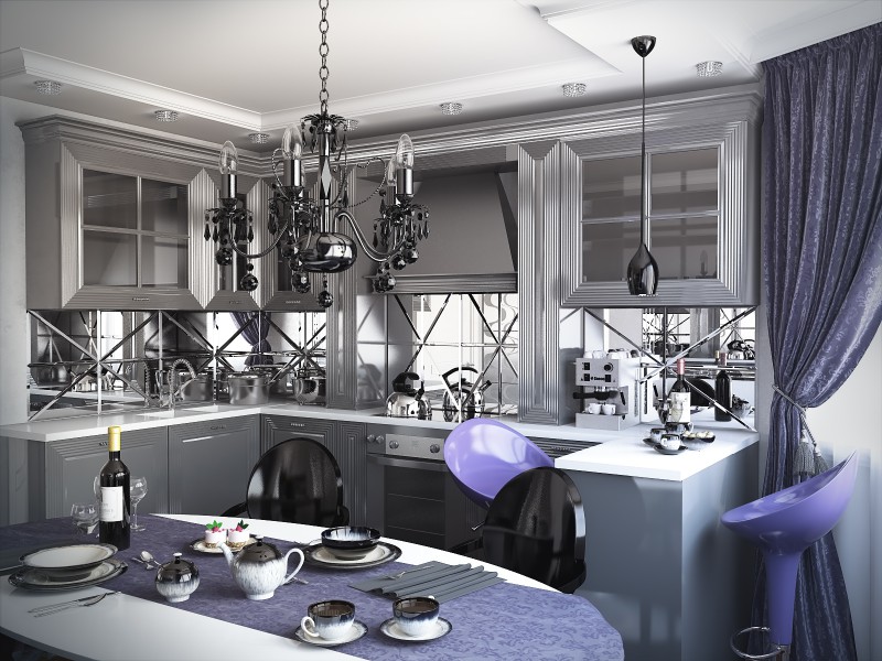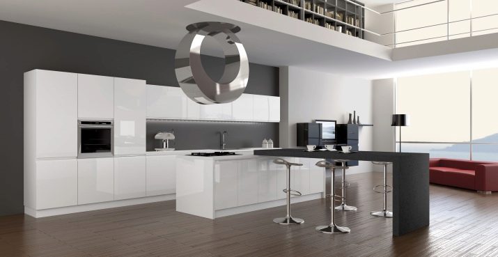 Kitchen set and dining area, as a rule, do not have any decorations and are made of chrome steel, glass, laminated MDF, wood. The color scheme is the contrast of black and white, metallic shades. Surfaces can be glossy or matte. The interior of the lockers should be ultra-modern, equipped with all the necessary mechanisms and closers for easy and silent opening of their leaves. Another nuance - built-in appliances, hidden in the kitchen. The lighting is cold, using spotlights and an interesting, futuristic chandelier (optional).
