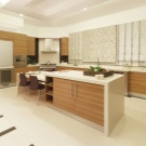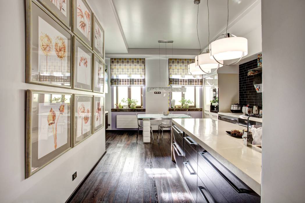- Parallel layout. This option, on the contrary, is more suitable for spacious rooms. Its feature is the placement of the kitchen unit in parallel in two rows, and between them a dining area is established. It is also possible that the table segment is installed in the corner, and in the middle an additional working “island” is installed.