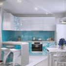 - Linear layout. It involves the placement of furniture in the work area along one wall. This option is good because it saves space and provides the ability to install a large dining headset. Do not forget that lockers for storage of kitchen utensils can be hung on the wall, then all appliances and work surfaces will fit perfectly. Also on the wall you can place open shelves for dishes, hang sets of auxiliary cutlery (cooks, skimmers, knives, etc.). If you still do not have enough space for all kitchen utensils, you can add an “island” - an additional work surface with a built-in sink or with drawers. Tabletop "island" can be used for a meal;