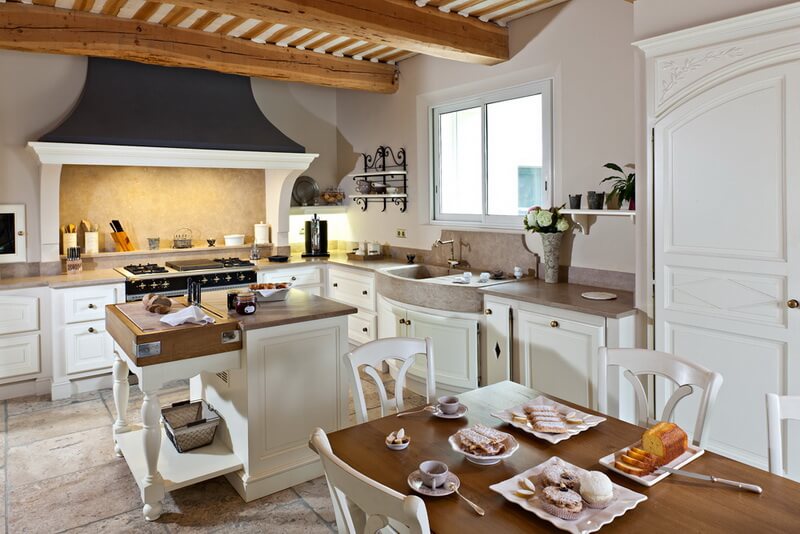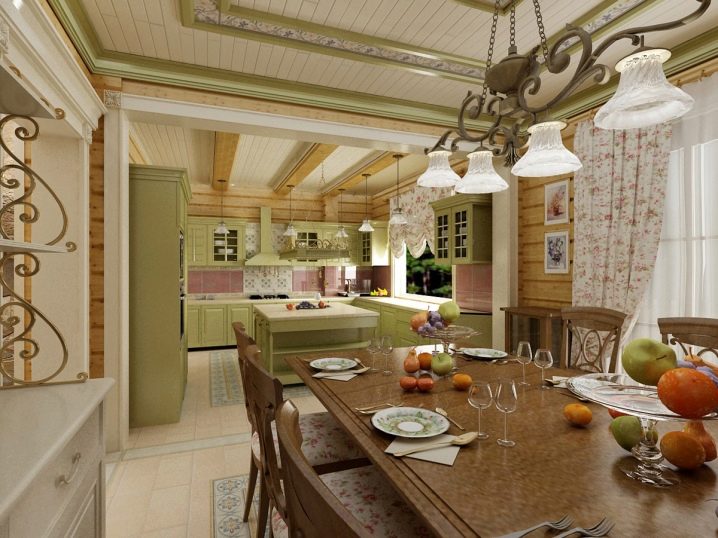Decorate the kitchen-dining room in the style of Provence flowers, lavender is especially popular; On the table you can lay a linen tablecloth, hang light curtains on the windows. A vintage wall clock will fit into such an interior very beautifully and organically.