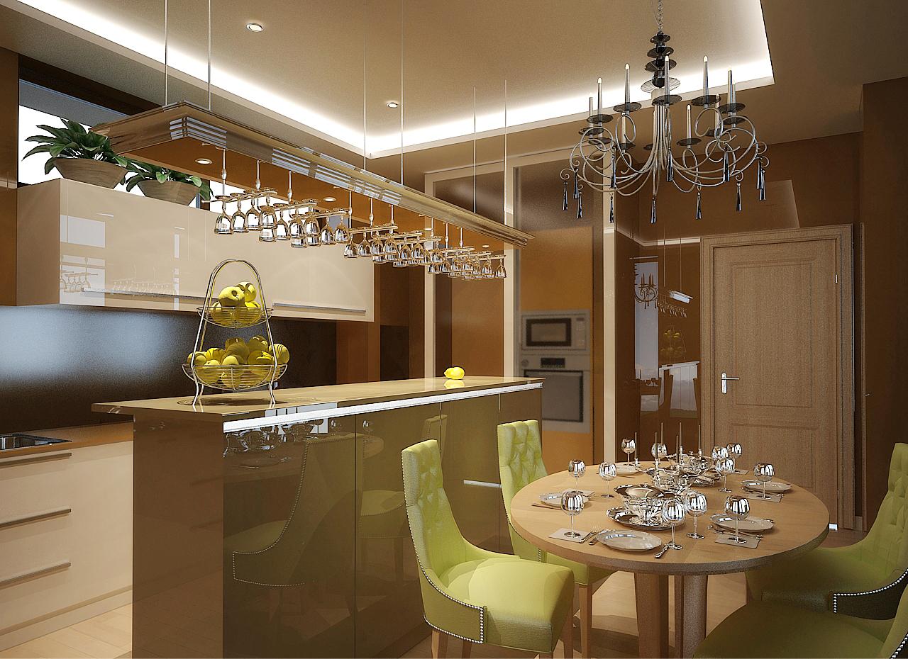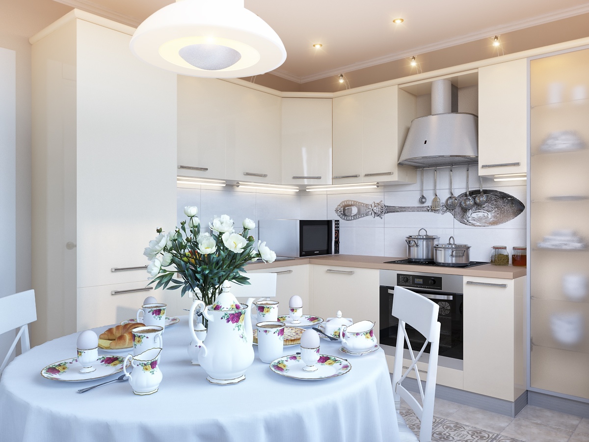 - Let's talk about lighting. Designers are advised to use warm soft light instead of cold daylight, as well as spot small bulbs,located along the perimeter of the kitchen instead of a single lamp in the center;