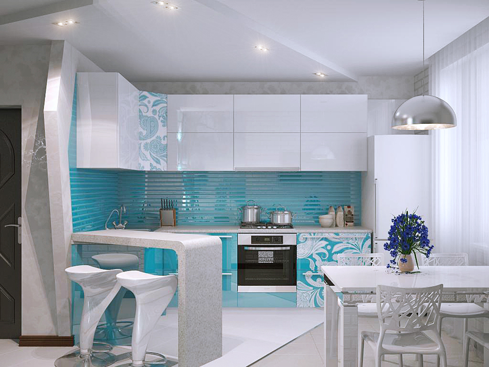 To choose the style of your kitchen-dining room, you need to focus on the overall style decision of the home.However, there should be unique touches that adorn the kitchen - for example, a set of beautiful dishes on an open shelf or interesting curtains. In general, modern design ideas and projects are very diverse and any, even the most ordinary and simple kitchen can be turned into a cozy stylish corner, if you turn on the fantasy and add a couple of bold "chips". For example, we usually store cutlery in a locker, and you can buy several brightly painted clay vases of various sizes, put them on a hanging shelf and place appliances in them. If desired, you can purchase other items in this style - a bright sugar bowl, pepper shaker, saltcellar, etc.