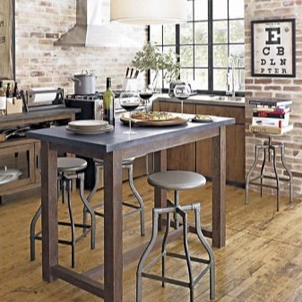 Such models of designs are suitable for short meals or a dinner group in a large kitchen. High stools can be with or without specks. The shape of the seat can be straight, concave or with a soft pillow. They are bought as an accent of the style of the finished interior. Such products are good for normal weight loads and are not suitable for people with high weight.