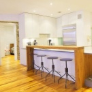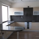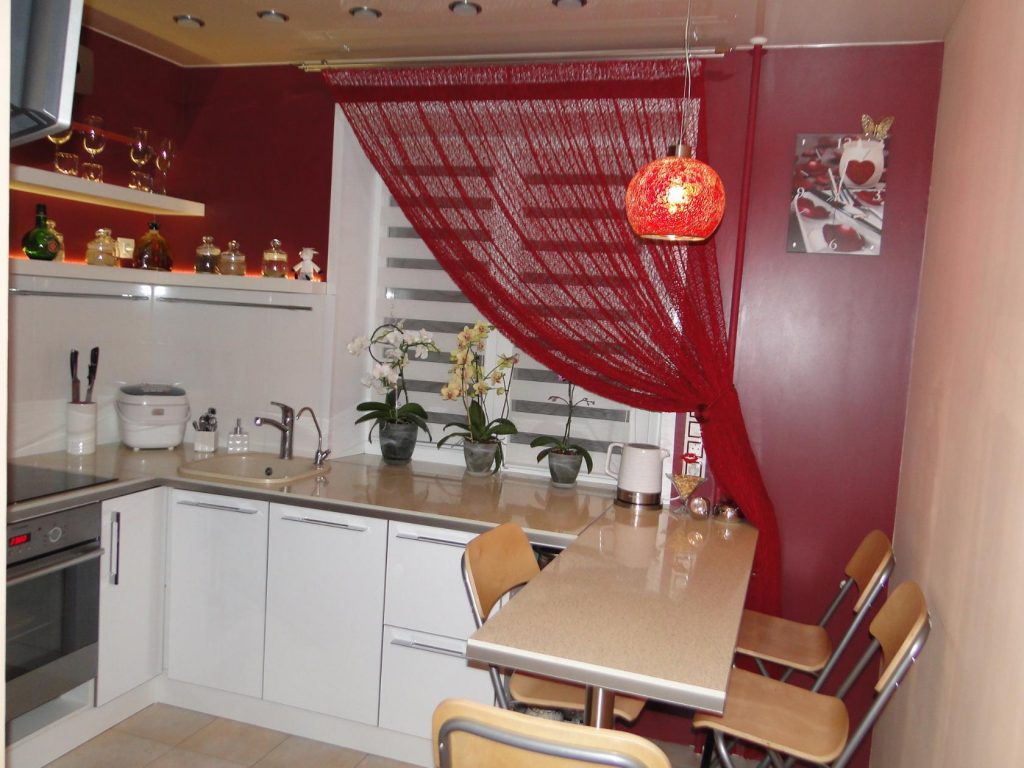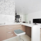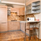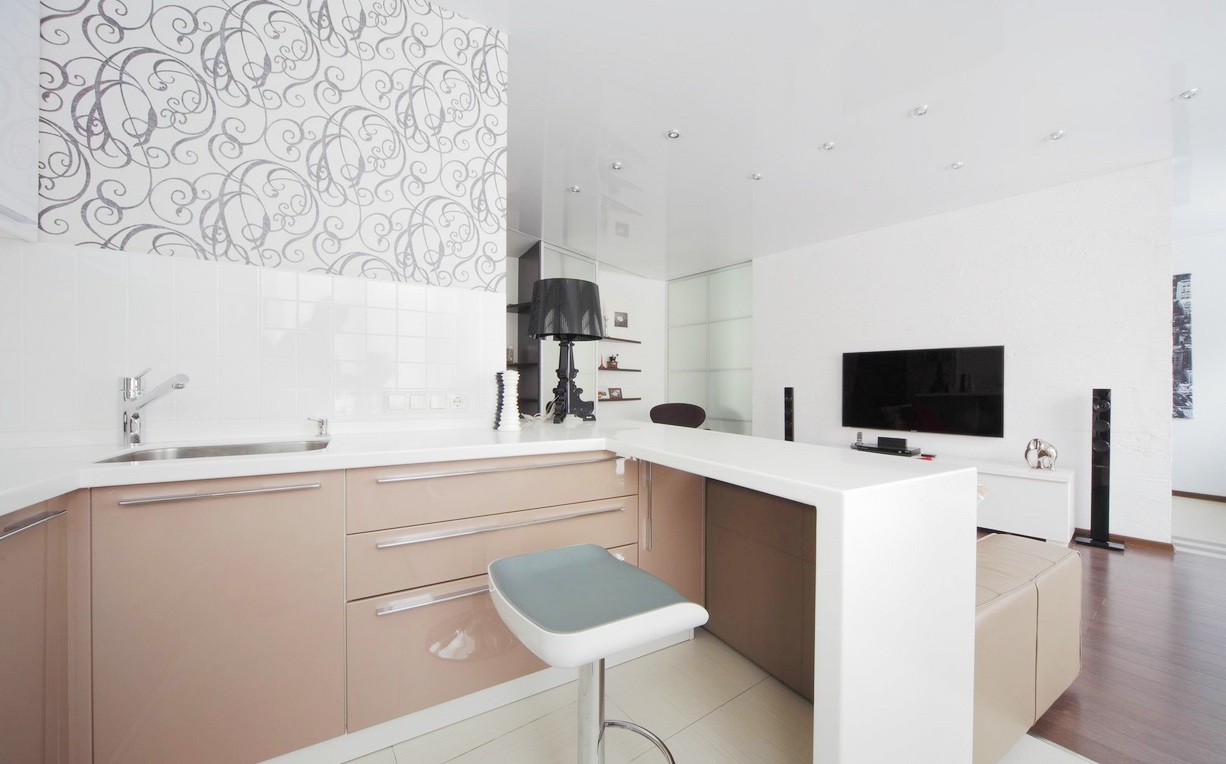 - In studio apartments, where there is no border between the kitchen and the hall, the bar counter can successfully divide these zones. This solution designers began to actively apply seven years ago. The main thing in this situation is to choose the same color for the bar and the living room or one that will suit both parts of the room, for example, the lilac corner kitchen with a beige color bar will be an excellent duet.