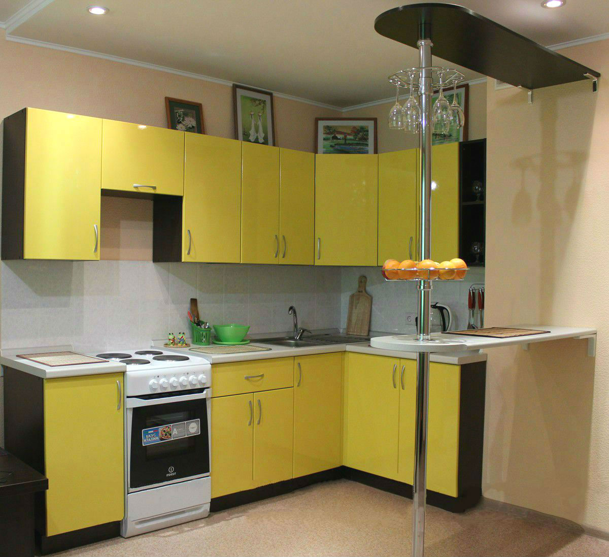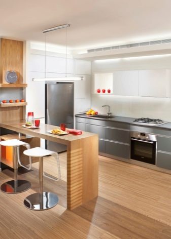 The bar counter is the perfect complement to the corner kitchen.This original piece of furniture will tell guests of the apartments that the owners have an excellent sense of taste, beauty, they follow the fashion trends. More often, bar counters that go straight from the tabletop are made of the same materials, this is done so that all parts of the interior complement each other, creating a single whole.