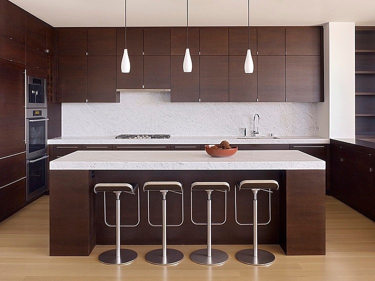 Title two-tier model speaks for itself. Such a bar counter is a combination of two tiers: the top bar area and the bottom one are cooking surfaces. This model performs two functions simultaneously, making it suitable for the interior of a small kitchen.