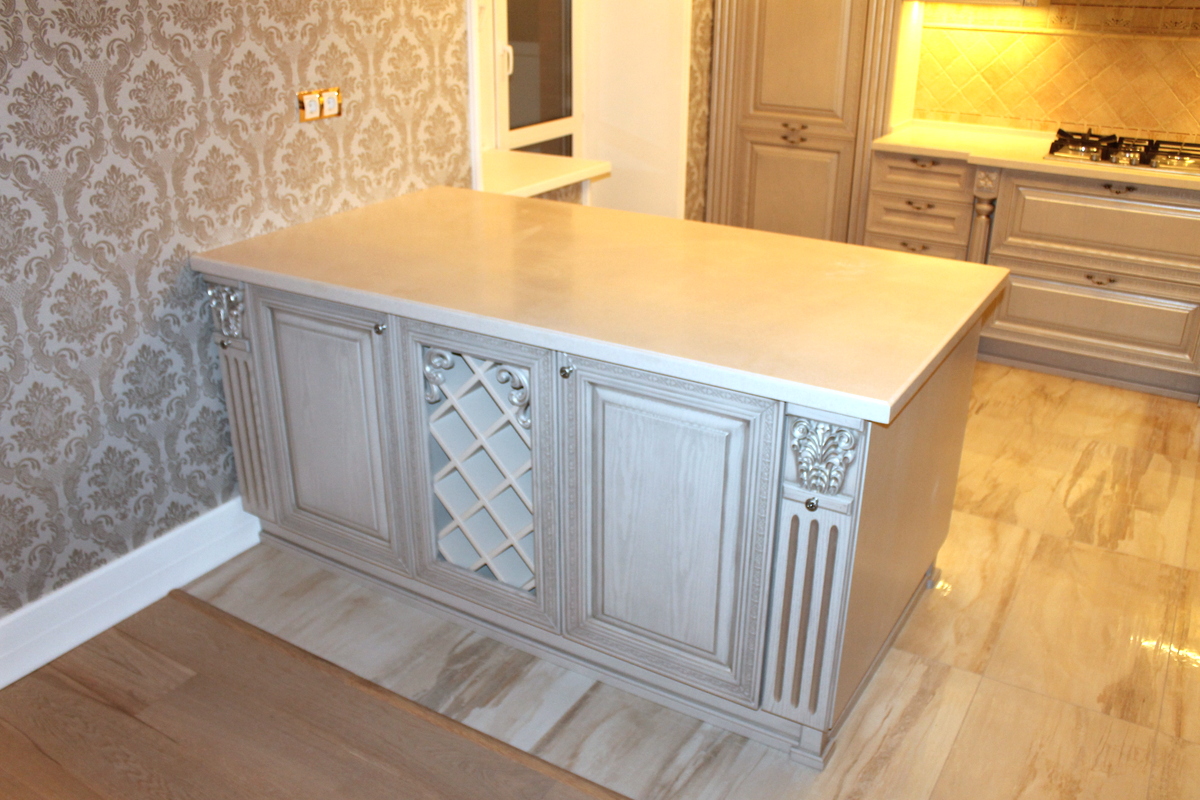 The material must correspond to that used for the production of countertops. In the case when the stand is a continuation of the kitchen, it is better to use artificial stone.