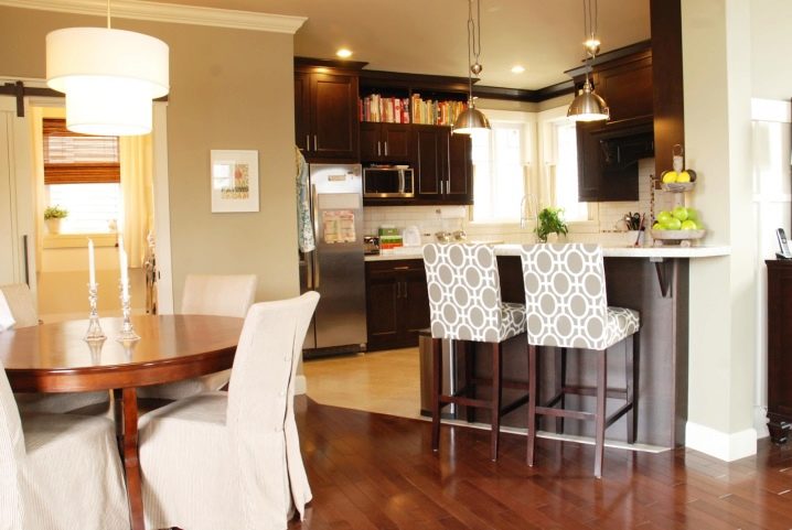 There are many different bar counters for the kitchen. Their optimum height is the distance between the table top and the floor of 120 cm. This solution allows you to create a cozy and warm atmosphere in the apartment, besides, it is very convenient to use the furniture in the room in this design.
