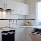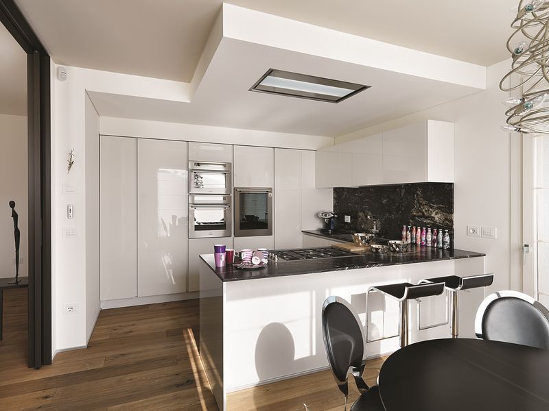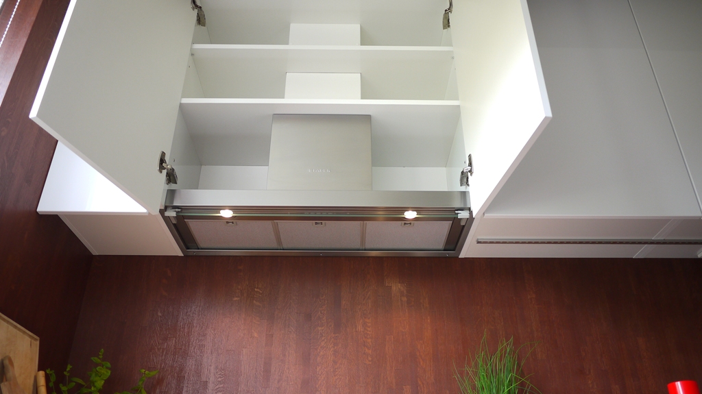 - Built-in hood can be located in the closet or in the countertop. The big advantage of this duct is that it is almost imperceptible and it occupies the minimum amount of space. This option is convenient if the kitchen is small. And also it is possible to note the relatively low cost of a household appliance. The budget option is suitable for those who appreciate quality and at the same time do not want to overpay.