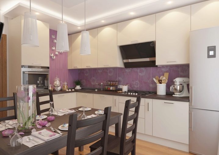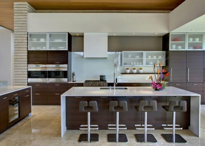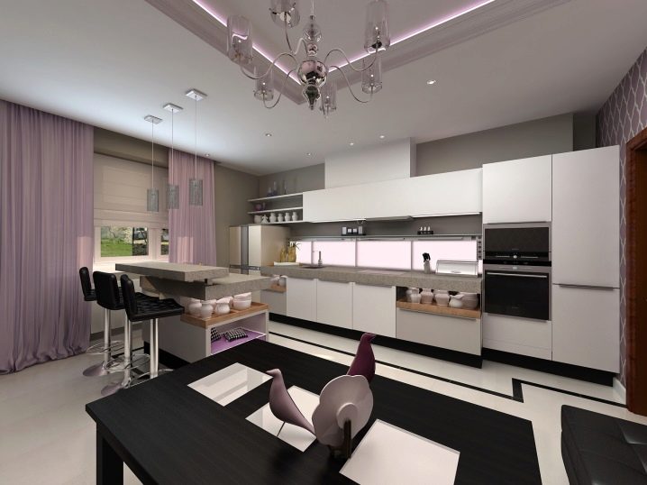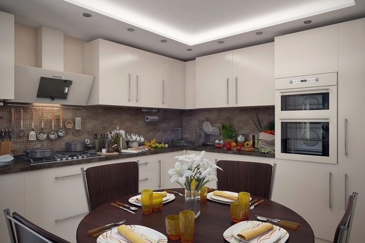 A kitchen hood, hidden under a suspended ceiling - this is also an interesting, and very practical solution. After all, there is so much free space, which means it's just the perfect solution, and not only for the kitchen hood, but also for electrical wiring (not to mention the possibility of hiding all the irregularities of the ceiling). With a properly resolved issue with ventilation, there will be no problems with sagging the ceiling, as well as with its lifting and fitting of the parts hidden behind it.