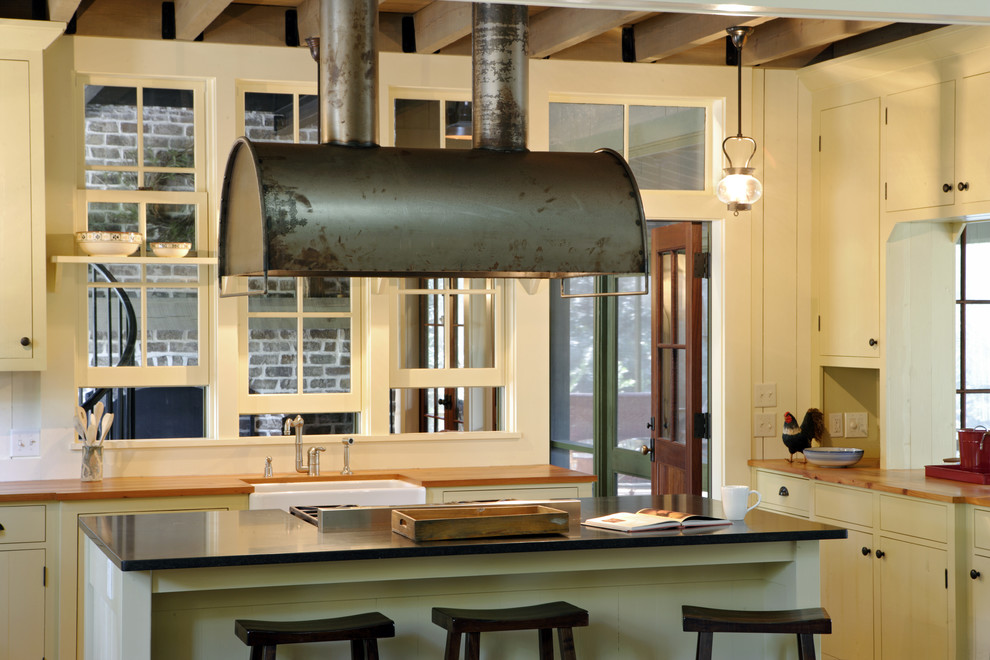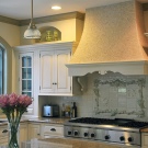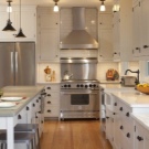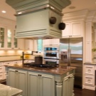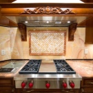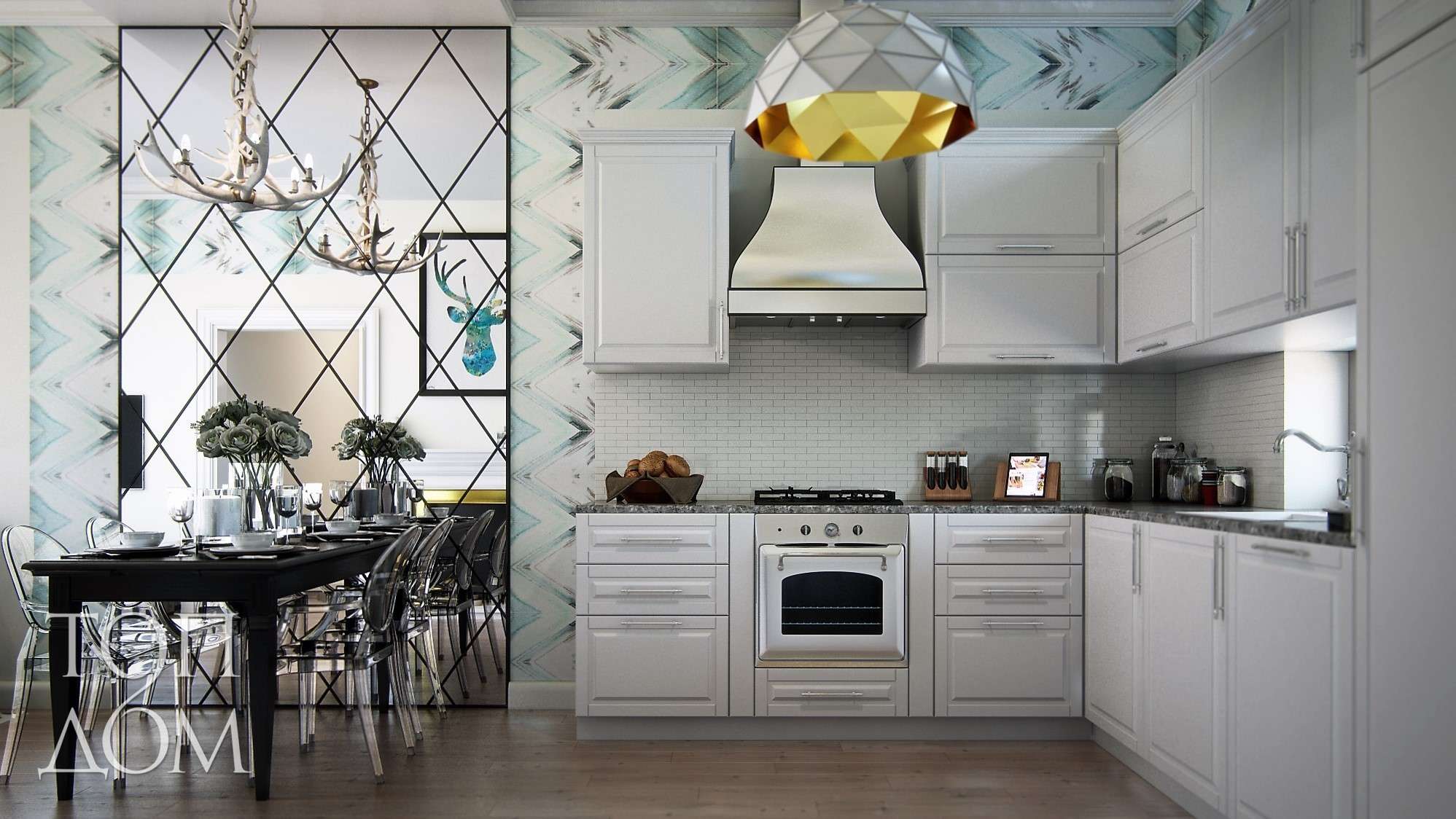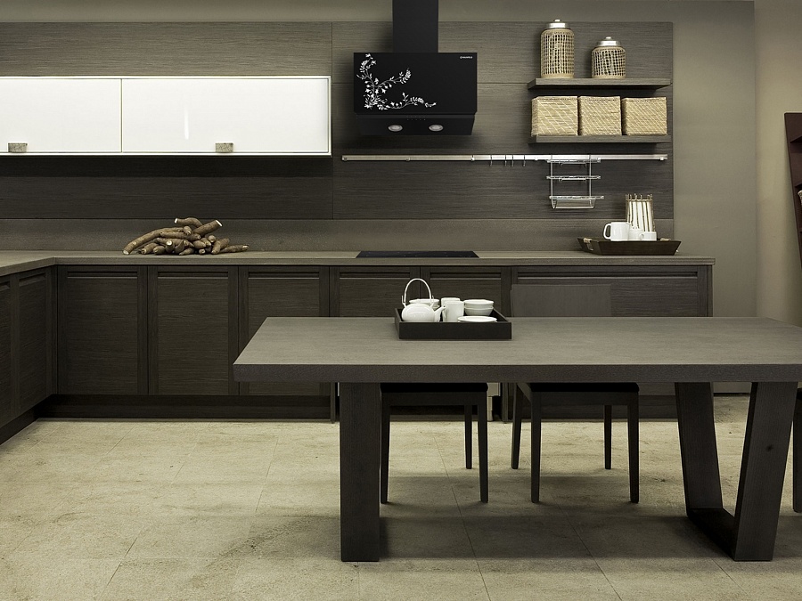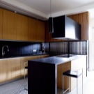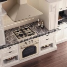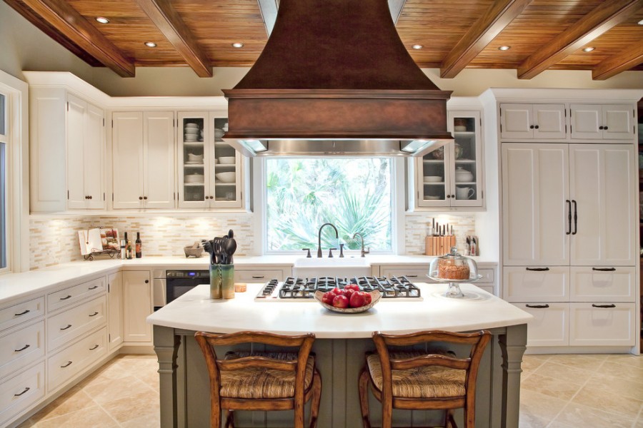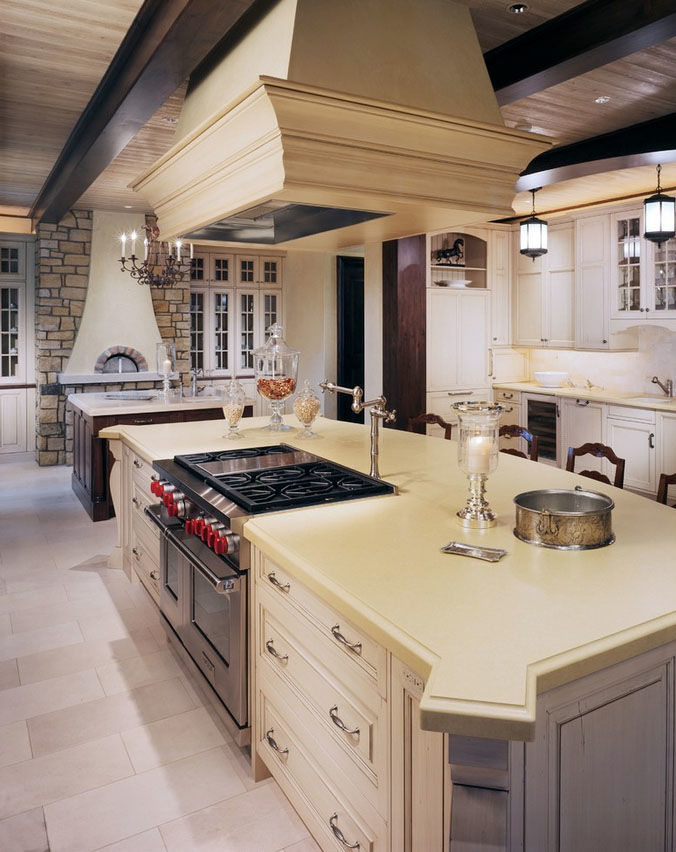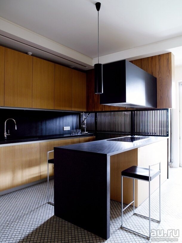 Rarely there are angular, quite a rare case for home cooking - an island hood, similar in design to the hood in the restaurant’s kitchen - above a large stove, which is located in the center of the room;