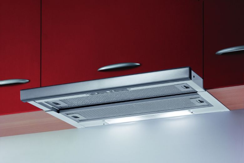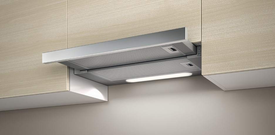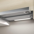 - Telescopic or retractable built-in hood. A flat device of rectangular shape, which consists of two surfaces-sliders connected by a special sliding mechanism. This "secret" kitchen ventilation is perfectly integrated into the set, does not clutter up the space, performs its functions no worse than the old-style hoods.