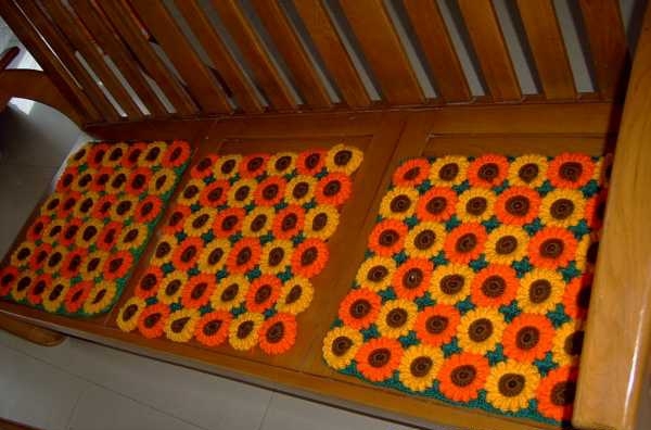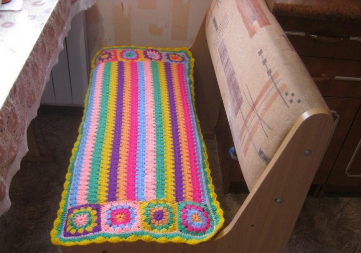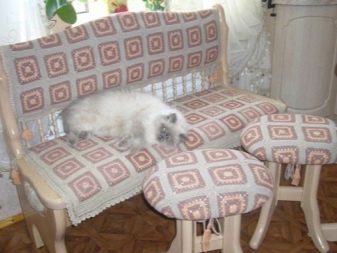 You can additionally decorate a knitted cover with embroidery, beads and other decorative elements and fix it on furniture, for example, tying it with ribbons to the legs of a corner. The cape with openwork knitting in light pastel colors looks very nice, but it is not very practical. It is rather a festive option, a reason to surprise the guests.