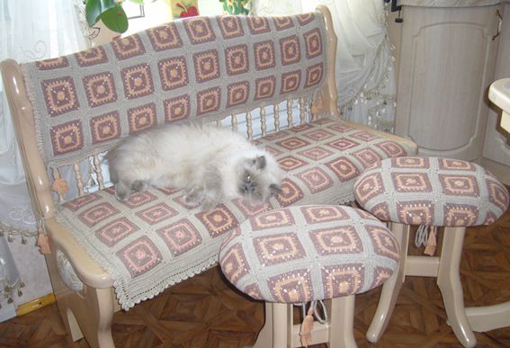Knitted covers fit perfectly in the style of Provence or Country. And although they are less practical than, for example, leather, capes, connected with their own hands, have a lot of advantages. First, it will be the pride of the hostess and the element of admiration of the guests. Secondly, it is an exquisite decoration for the kitchen corner.And thirdly, such a cape will definitely be in a single copy and no one, except you, will be able to boast of it.