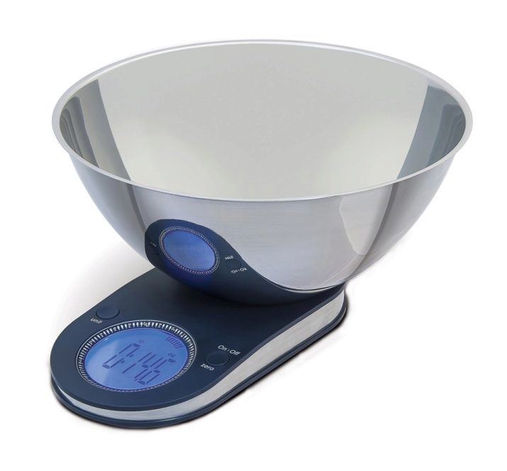 Modern devices measure products in grams, kilograms or ounces. Some models are endowed with additional technical characteristics: sequential weighing, measuring the mass of each product in turn, if you put several ingredients in the bowl. Also scales can count caloric content of products, measure the volume of liquid in milliliters, reset the container, choose the unit of measurement, notify on exceeding the permissible load.