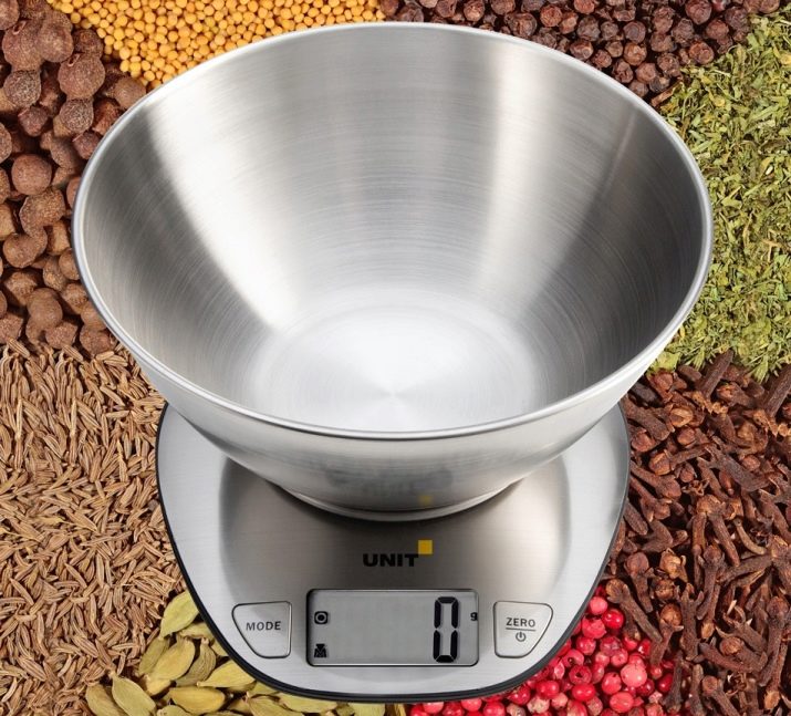 - "Unit" (Unit). Model Unit, reviews of this device can be read, inexpensive. This electronic design has a weighing bowl that can withstand loads of up to five kilograms. It gives accurate results, measures the volume of liquid, turns off by itself. The platform is made of stainless steel.